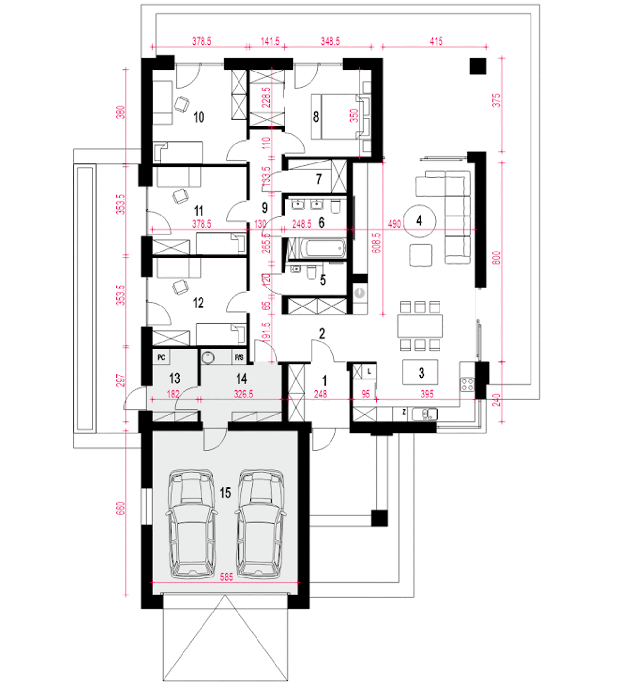 Wypełnij formularz i otrzymaj rysunki w pdf z dokładnymi wymiarami budynku i pomieszczeń (długość, szerokość, wysokość) dla projektu Laura II z garażem 2-st. A