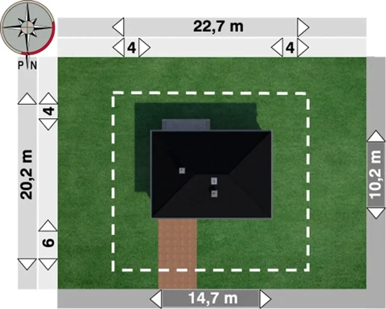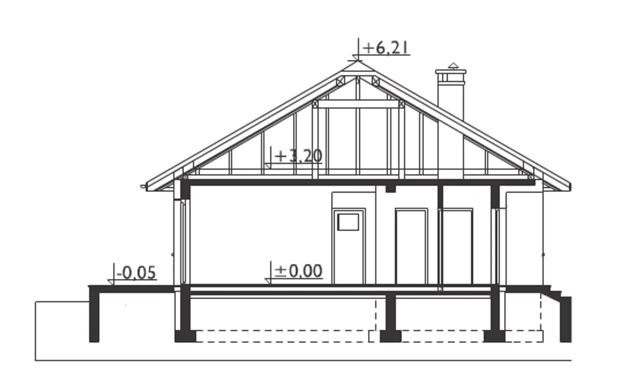 - rzut dachu - ukazuje jego kształt, wymiary, kąt nachylenia połaci, rozmieszczenie okien połaciowych, lukarn, świetlików i rur spustowych, pokazuje rozmieszczenie kominów i informuje o sposobie odwodnienia: rozmieszczeniu i rozmiarach rynien