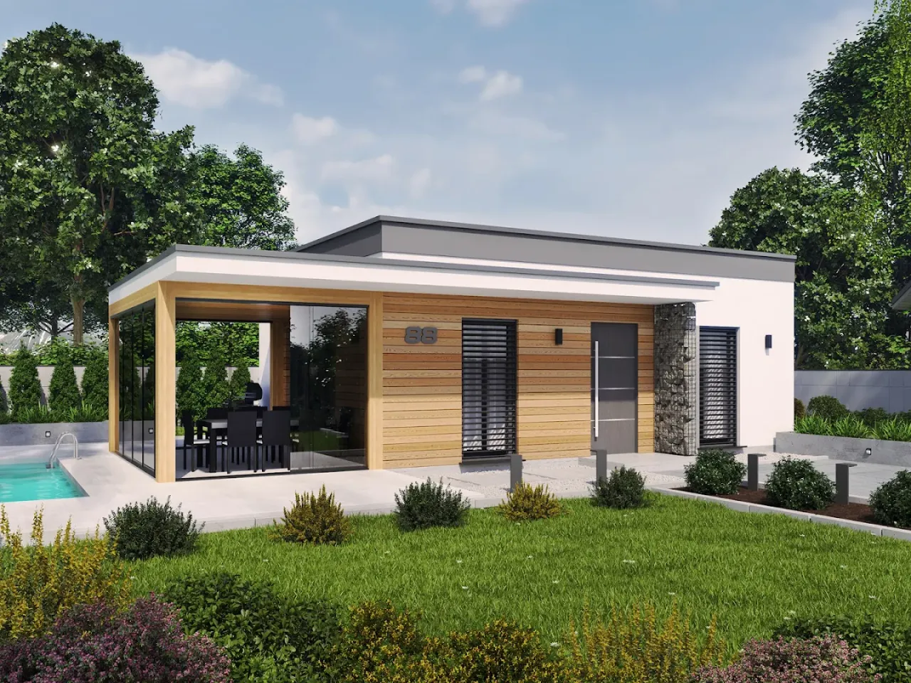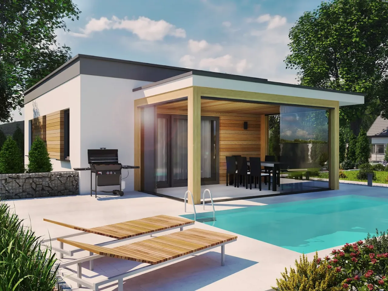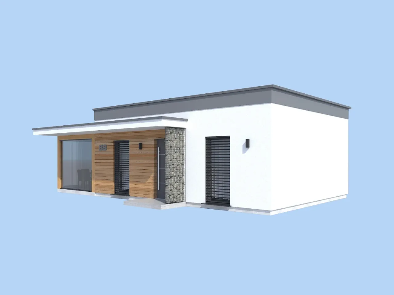 Wizualizacja projektu domu letniskowego Lens 2 urzeka swoją nowoczesną i minimalistyczną architekturą, która idealnie wpisuje się w otoczenie przyrody. Przezroczyste ściany zapewniają doskonałe doświadczenie panoramicznych widoków, co sprawia, że każdy dzień staje się bliskim kontaktom z otaczającym krajobrazem. Harmonia z naturą podkreślona przez zastosowanie naturalnych materiałów jak drewno, oraz płaski dach wtapiający się w krajobraz to prawdziwa uczta dla oczu i duszy. Rozwiązania ekologiczne takie jak duża przestrzeń na instalacje solarne to zdecydowany atut, czyniący ten projekt zarówno pięknym, jak i funkcjonalnym. Idealne miejsce odosobnienia dla rodziny ceniącej sobie spokój, ale też niezwykłe momenty razem, gdzie każdy zakątek domu inspiruje do relaksu i spędzania czasu z bliskimi.