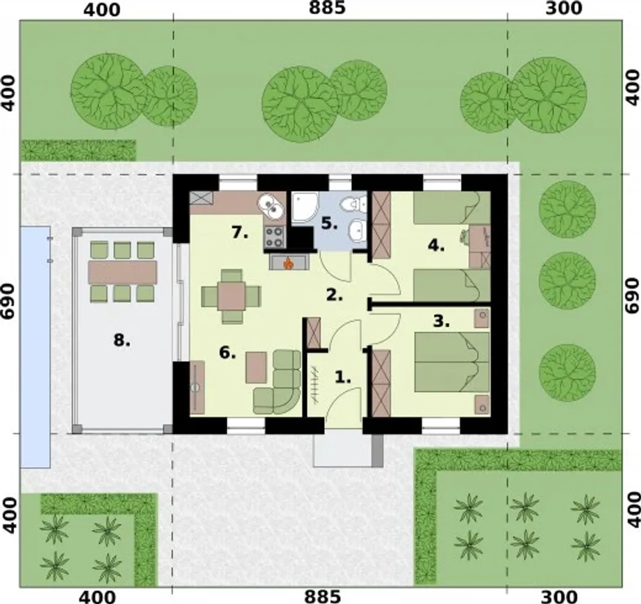 Wypełnij formularz i otrzymaj rysunki w pdf z dokładnymi wymiarami budynku i pomieszczeń (długość, szerokość, wysokość) dla projektu Lens 2 dom letniskowy