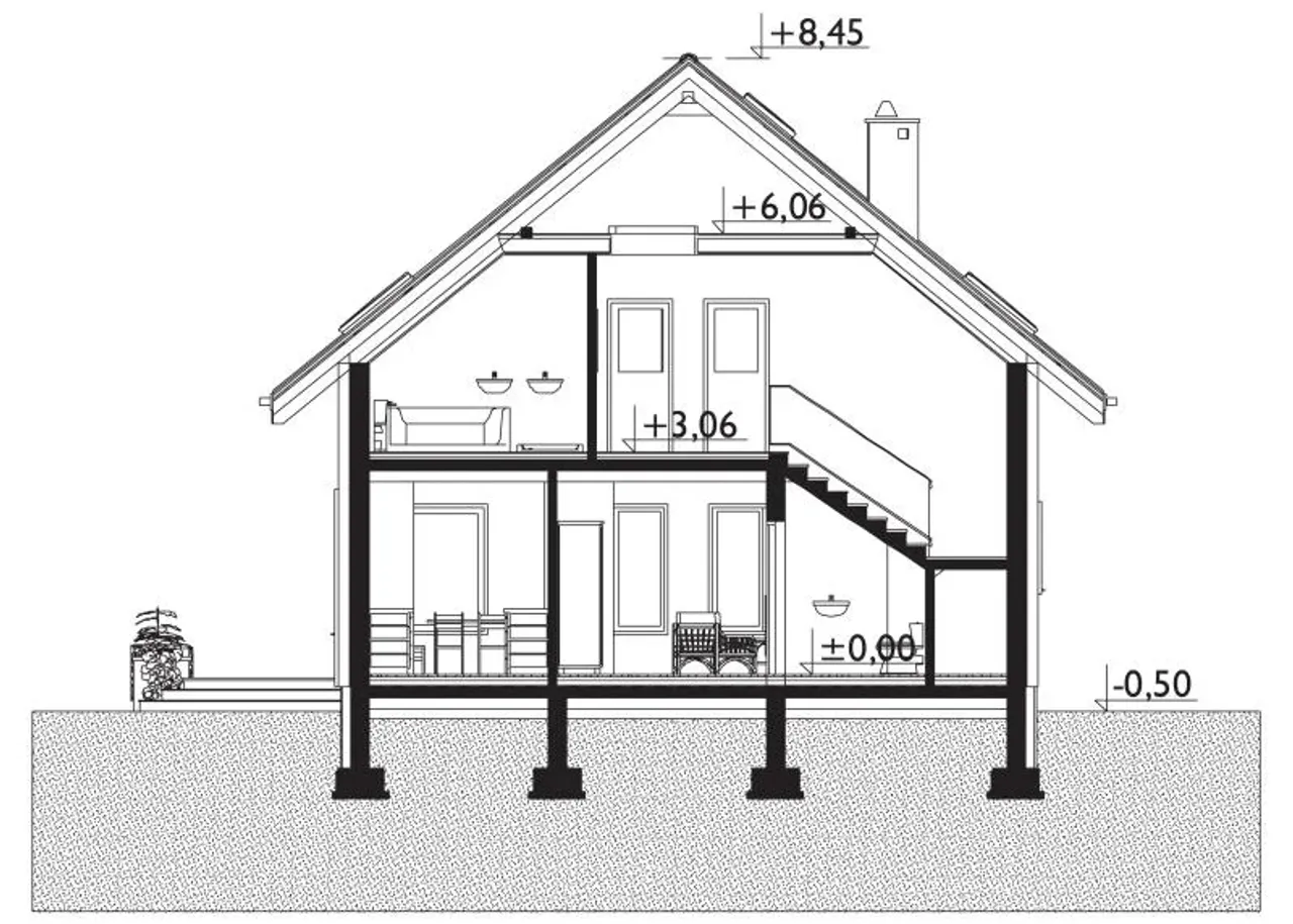 - przekroje - pokazują wszystkie elementy budynku po przecięciu go wzdłuż lub w poprzek od dachu do fundamentów tj. warstwy podłogi, stropów i dachu