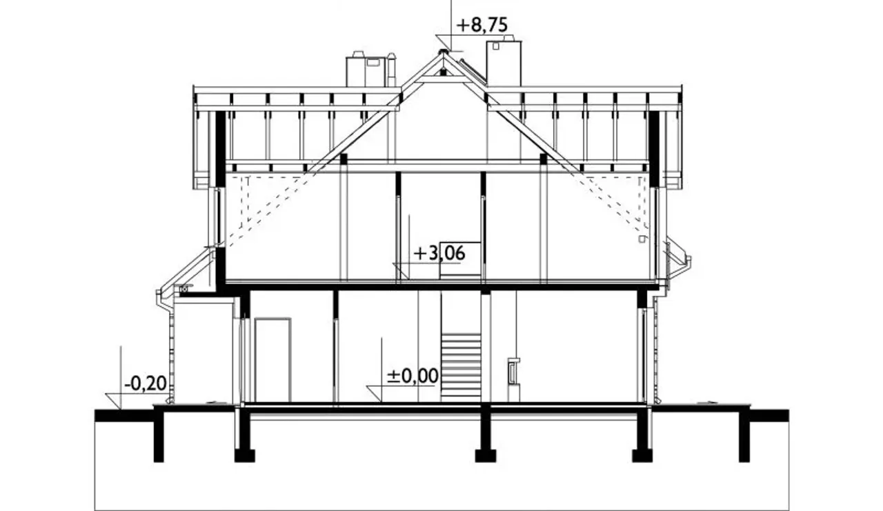 - rzut dachu - ukazuje jego kształt, wymiary, kąt nachylenia połaci, rozmieszczenie okien połaciowych, lukarn, świetlików i rur spustowych, pokazuje rozmieszczenie kominów i informuje o sposobie odwodnienia: rozmieszczeniu i rozmiarach rynien