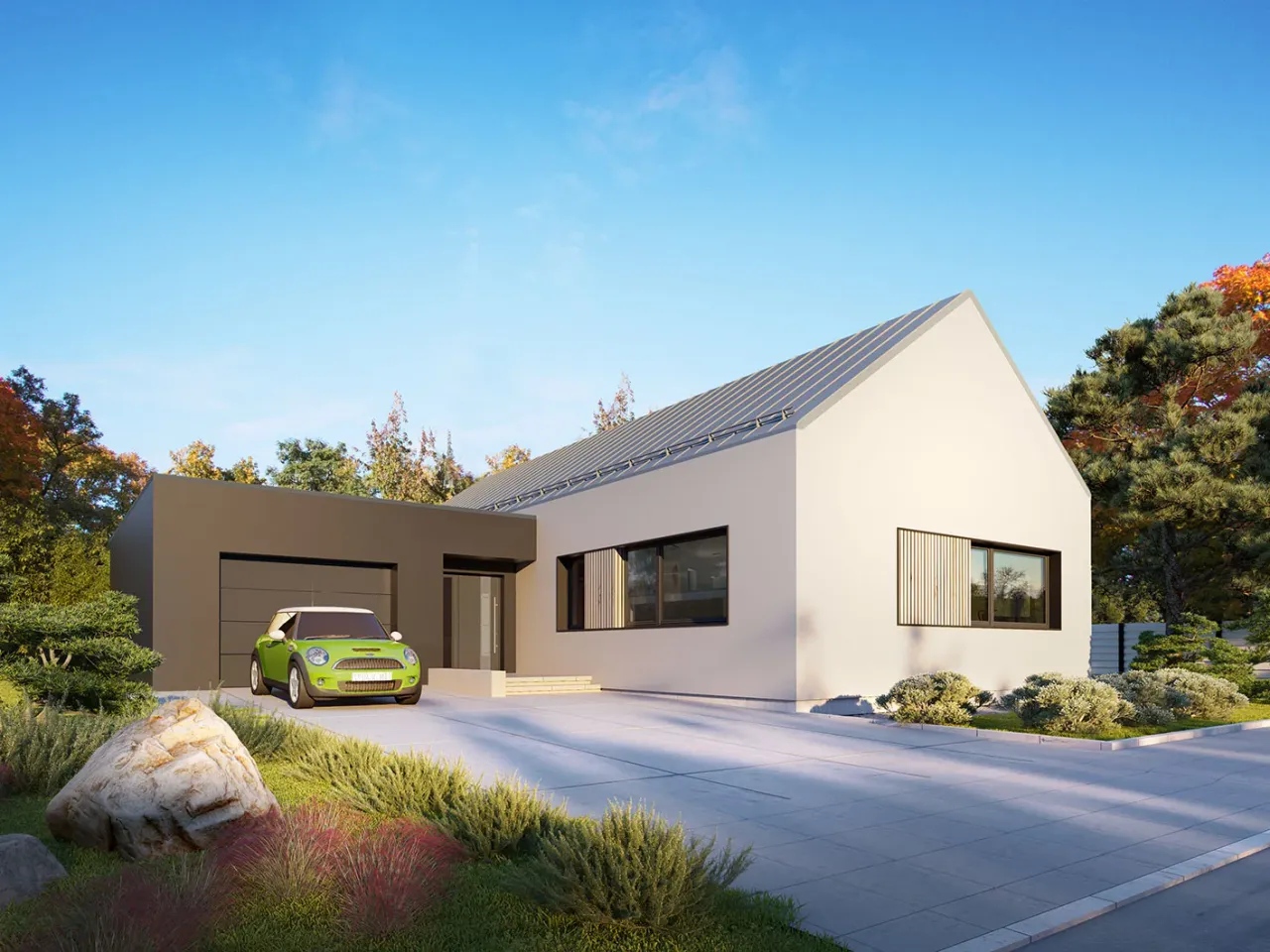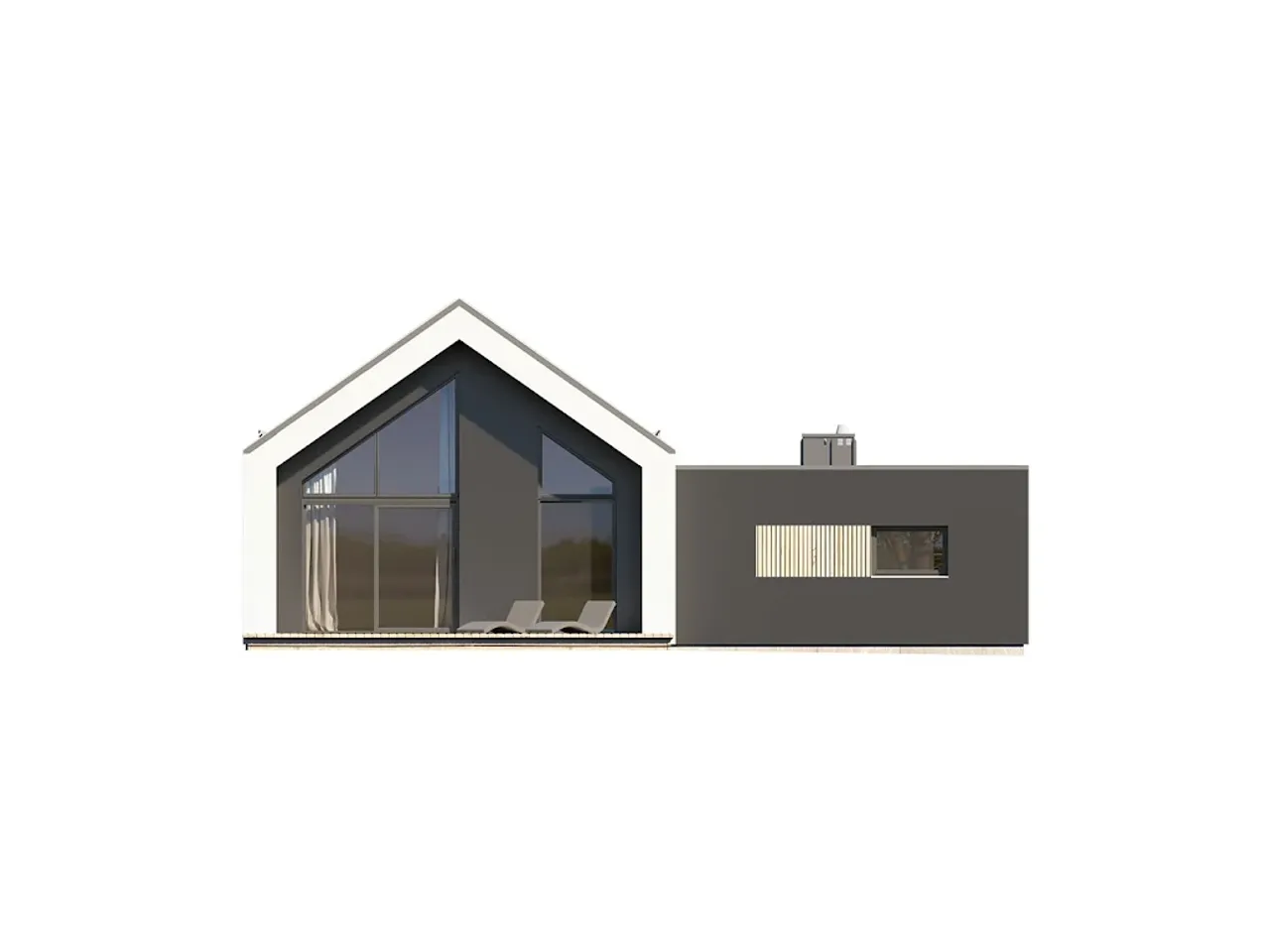 Bryła budynku na planie L z dużym tarasem zaprasza do relaksu na świeżym powietrzu. Nowoczesna elewacja z tynku i szalówki, solidny dach dwuspadowy (o nachyleniu 35°) z możliwością wykończenia dachówką lub blachodachówką są nie tylko trwałe, ale i wpisują się w aktualne trendy architektoniczne. Ogrzewanie domu można dostosować do swoich oczekiwań, korzystając z gazu lub paliwa stałego.