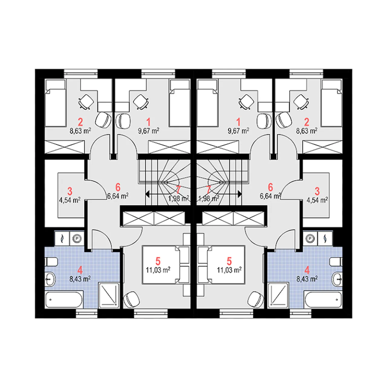 - rzuty wszystkich kondygnacji- pokazuje rozmieszczenie poszczególnych pomieszczeń i ich wymiary, powierzchnie, rozmieszczenie ścian, rozmieszczenie otworów drzwiowych, okiennych, urządzeń kuchennych i sanitarnych