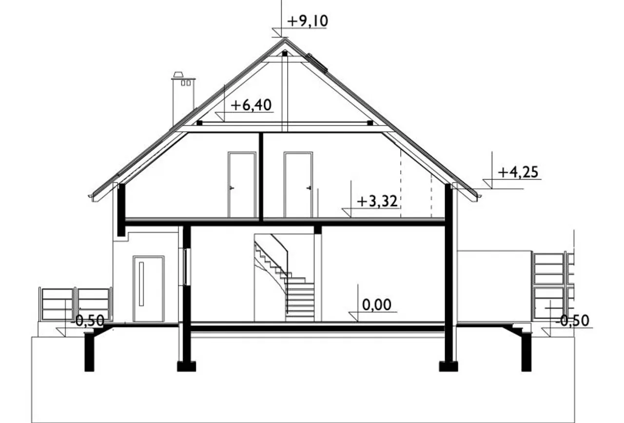 - rzut dachu - ukazuje jego kształt, wymiary, kąt nachylenia połaci, rozmieszczenie okien połaciowych, lukarn, świetlików i rur spustowych, pokazuje rozmieszczenie kominów i informuje o sposobie odwodnienia: rozmieszczeniu i rozmiarach rynien