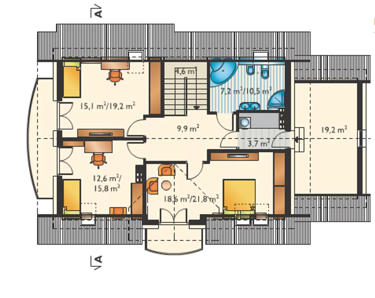- rzut dachu - ukazuje jego kształt, wymiary, kąt nachylenia połaci, rozmieszczenie okien połaciowych, lukarn, świetlików i rur spustowych, pokazuje rozmieszczenie kominów i informuje o sposobie odwodnienia: rozmieszczeniu i rozmiarach rynien