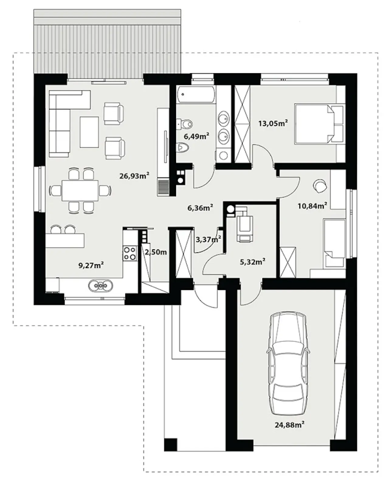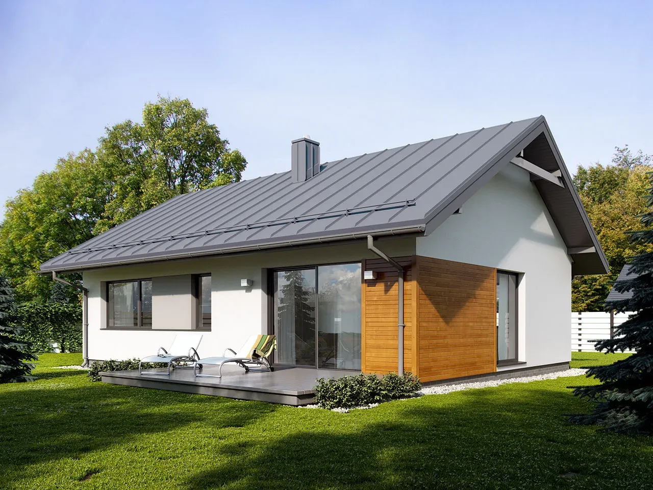Gotowy projekt domu LORO to niewielkich rozmiarów jednorodzinny dom parterowy. Przeznaczony jest dla 3-osobowej rodziny. Pomimo niewielkiej powierzchni, wnętrze zostało zaprojektowane w bardzo przestrzenny i funkcjonalny sposób. Projekt domu LORO to prosta i klasyczna bryła z nowoczesnymi elewacjami.