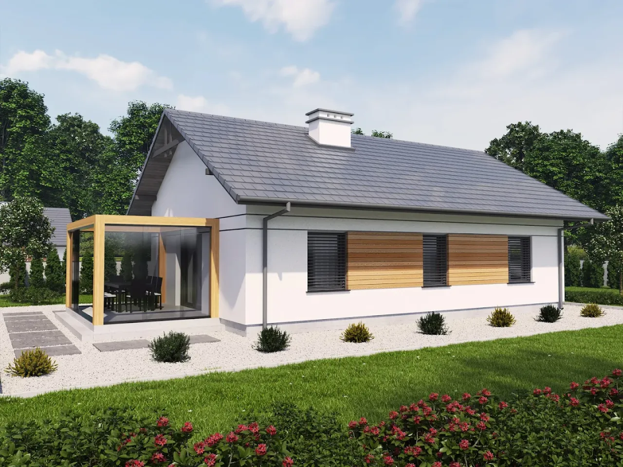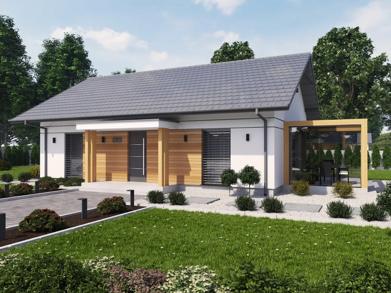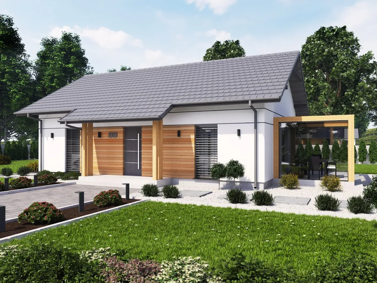 Projekt domu Lugo 2 idealnie wpisuje się w współczesne oczekiwania osób pragnących połączyć funkcjonalność z nowoczesnym designem. Architektura tego domu skupia w sobie elegancję i minimalistyczny styl, co przyciąga uwagę i czyni go atrakcyjnym wyborem dla rodziny ceniącej sobie zarówno estetykę, jak i praktyczność. Szczególnie fascynująca jest harmonijna kompozycja wnętrza z przestrzennym salonem, który staje się sercem domu, idealnym do rodzinnego spędzania czasu. Zewnętrzna forma budynku z subtelnymi detalami, jak dużo przeszkleń, nadaje wyjątkowy charakter. Projekt Lugo 2 to więcej niż dom; to przestrzeń, która inspiruje do życia w zgodzie z naturą i nowoczesnością.
