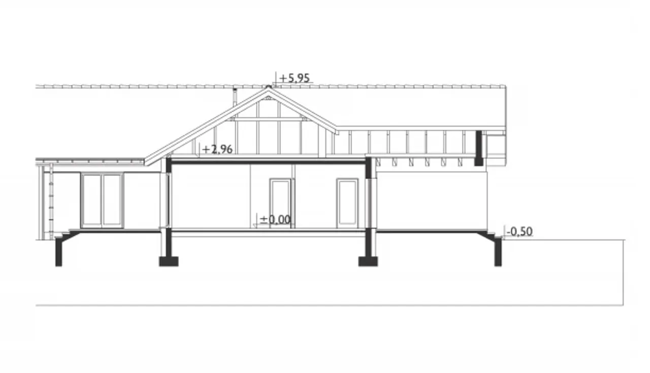 - rzut dachu - ukazuje jego kształt, wymiary, kąt nachylenia połaci, rozmieszczenie okien połaciowych, lukarn, świetlików i rur spustowych, pokazuje rozmieszczenie kominów i informuje o sposobie odwodnienia: rozmieszczeniu i rozmiarach rynien