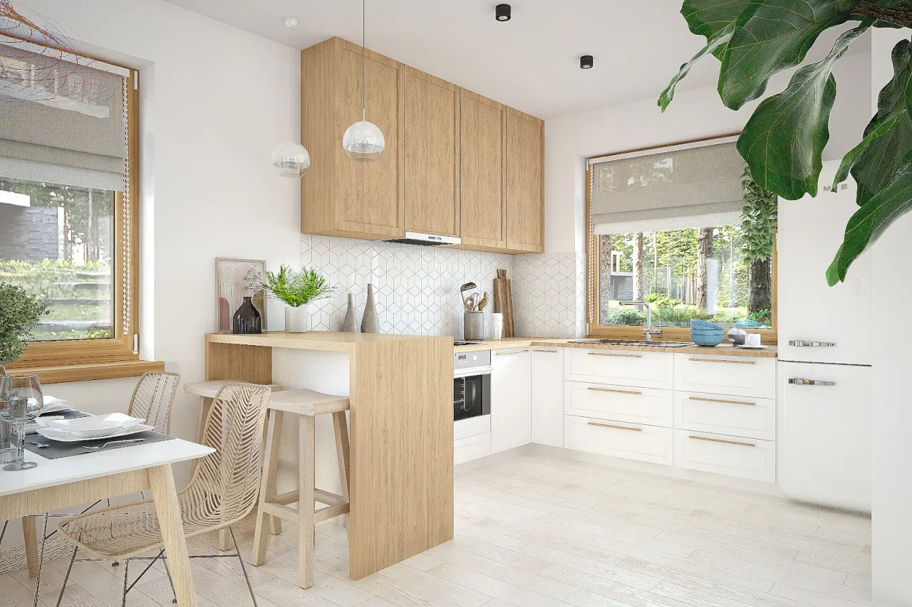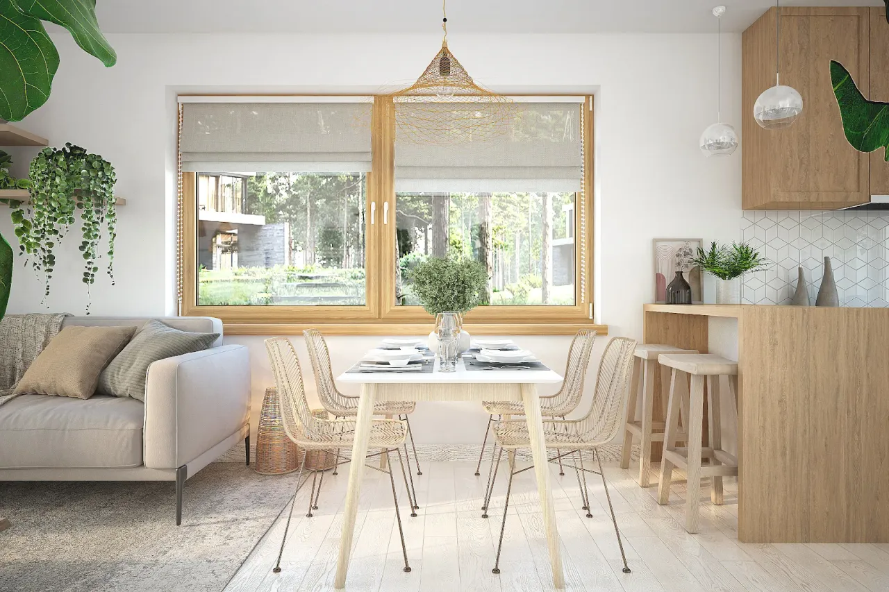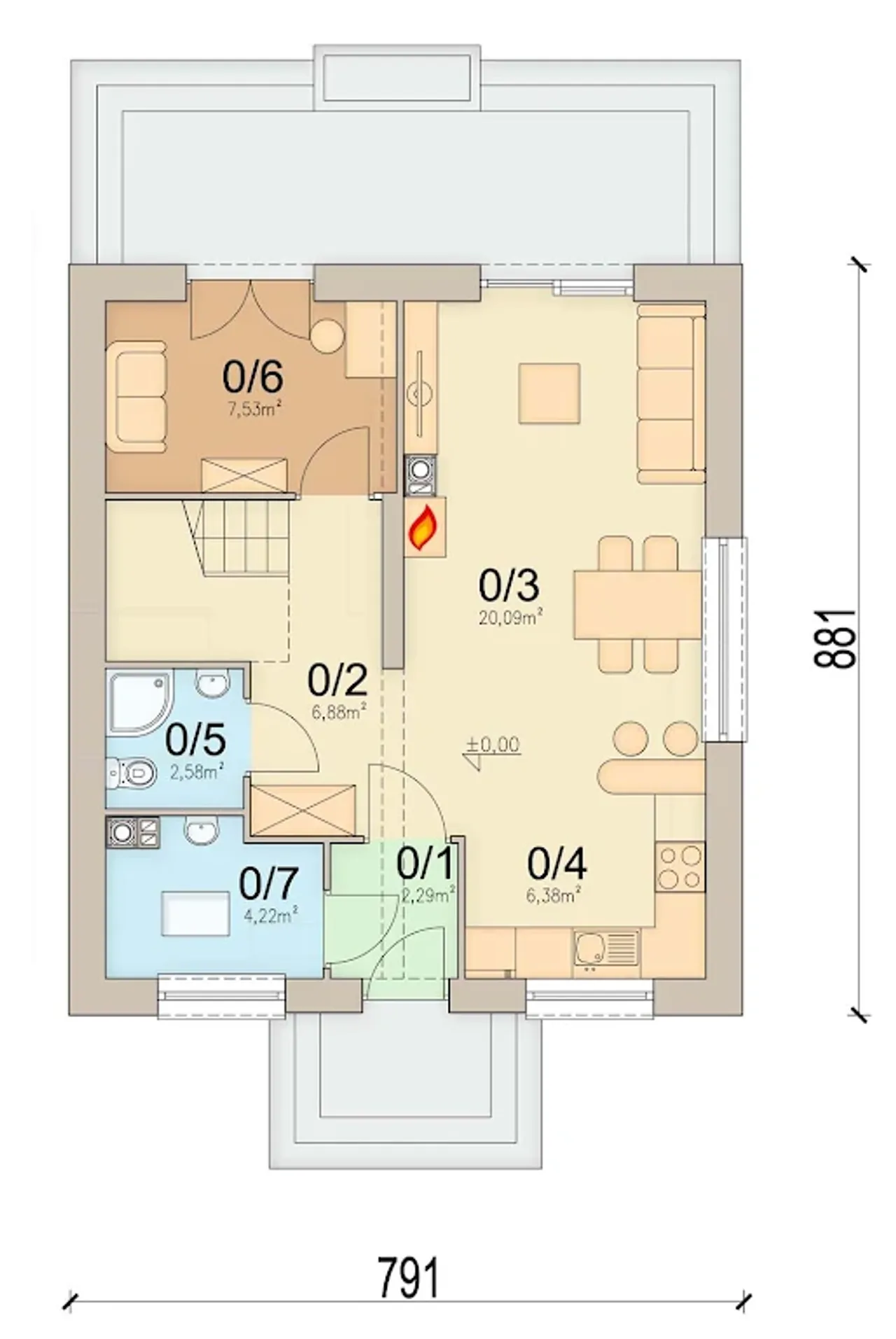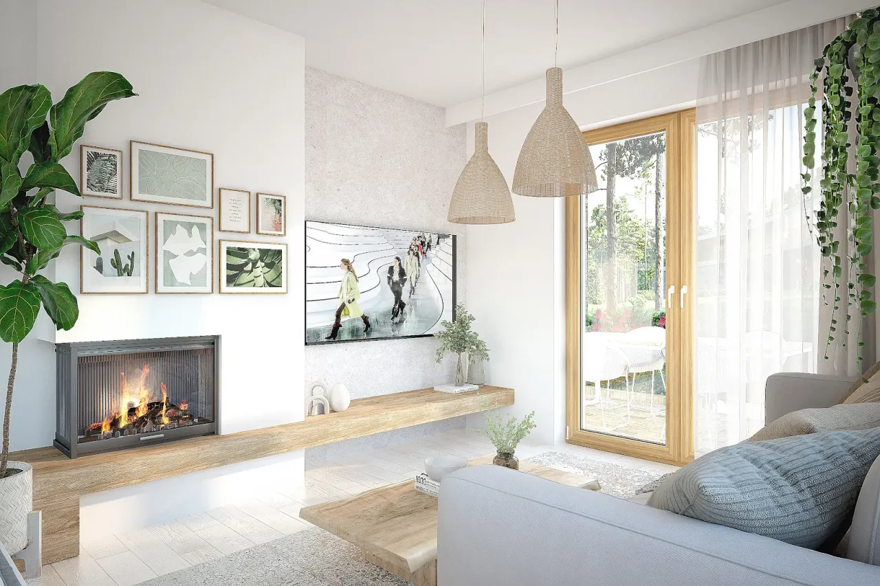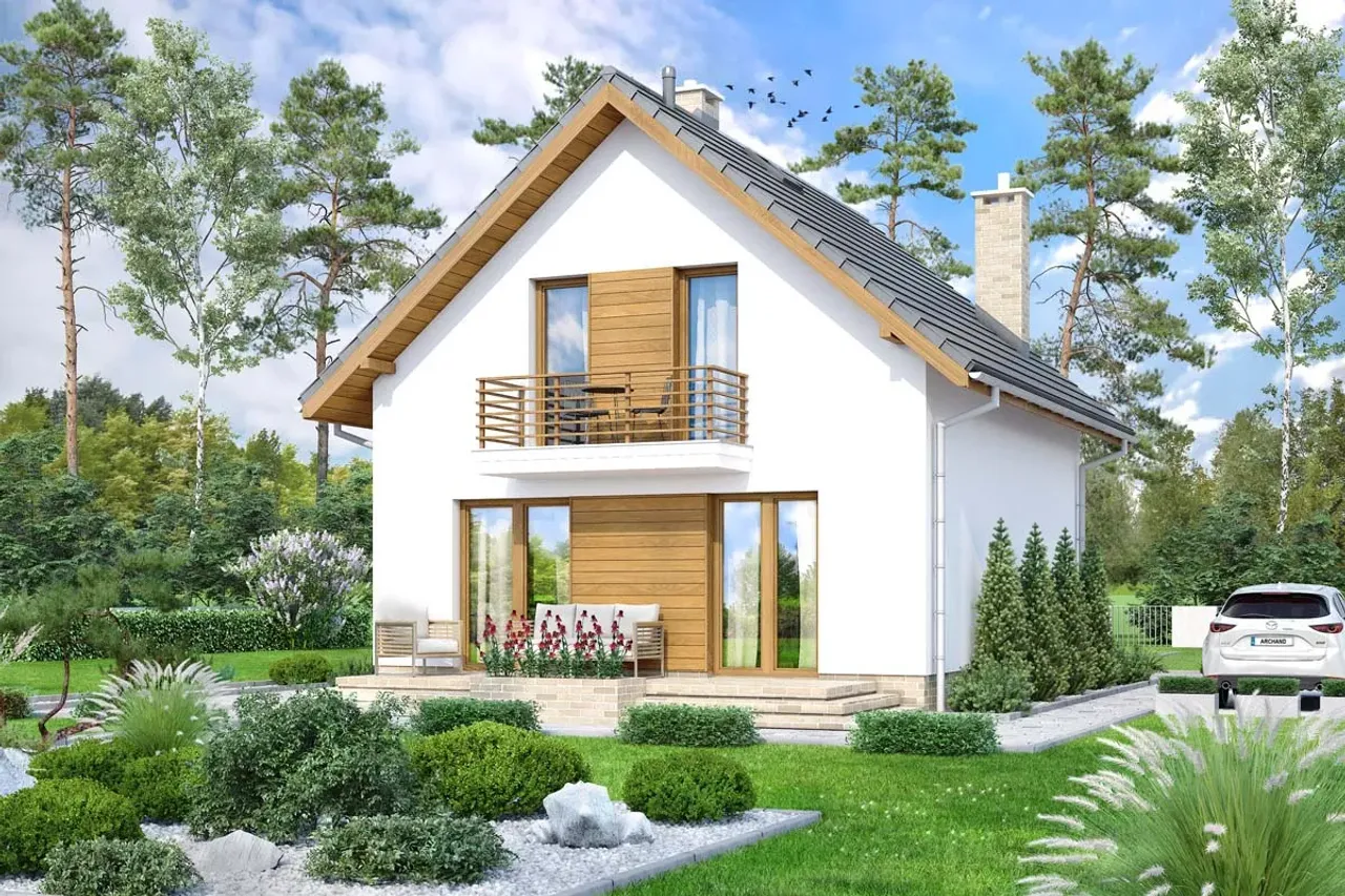 Projekt nie przewiduje garażu, co sprawia, że dom doskonale sprawdzi się zarówno na węższych działkach, jak i w środowisku podmiejskim czy wiejskim. Otwarta przestrzeń parteru z kominkiem oraz bezpośrednim wyjściem na taras staje się centrum życia rodzinnego oraz miejscem odpoczynku niezależnie od pory roku. Poddasze z przemyślanym rozkładem pokoi pozwala spełnić potrzeby nawet większej rodziny.