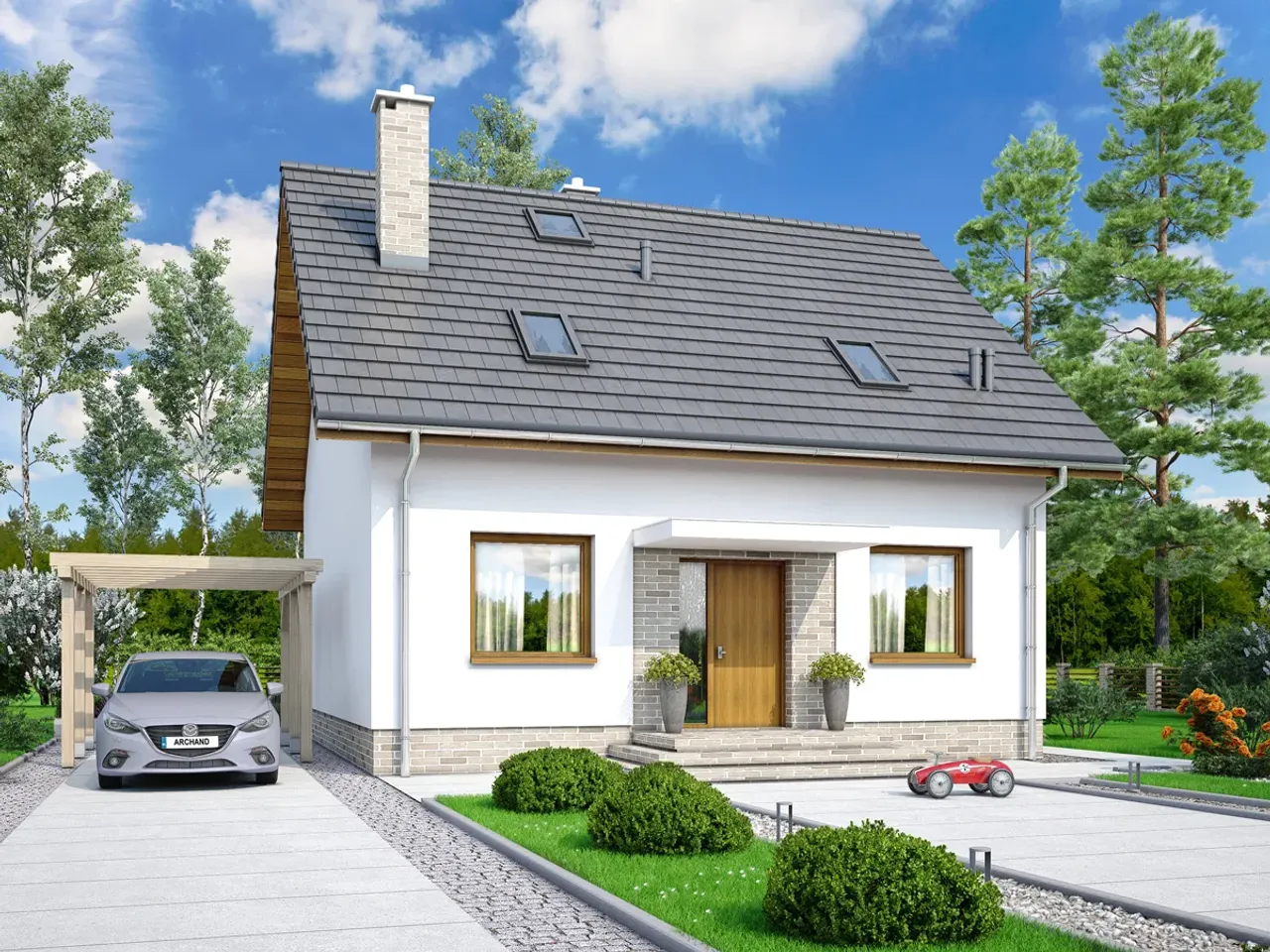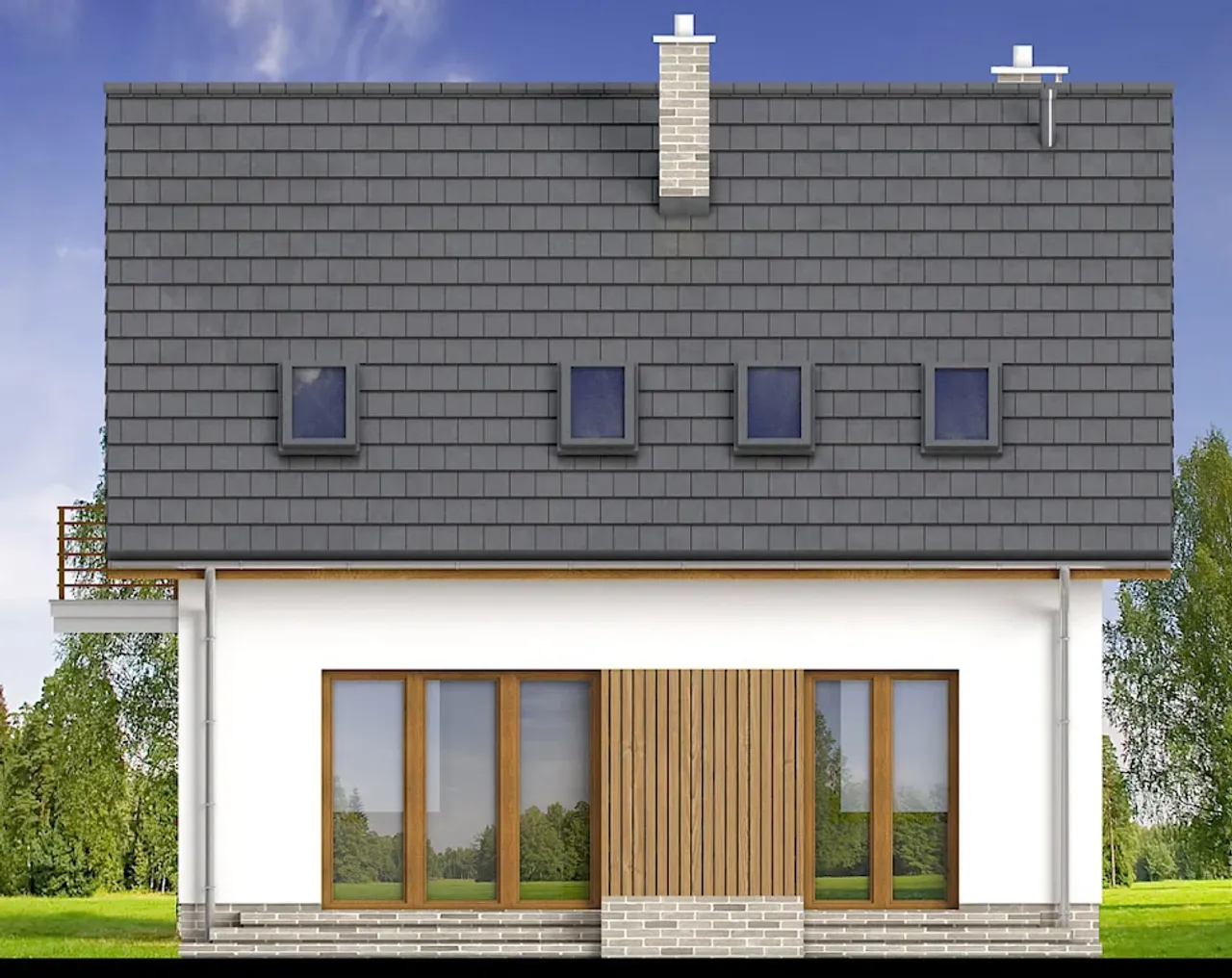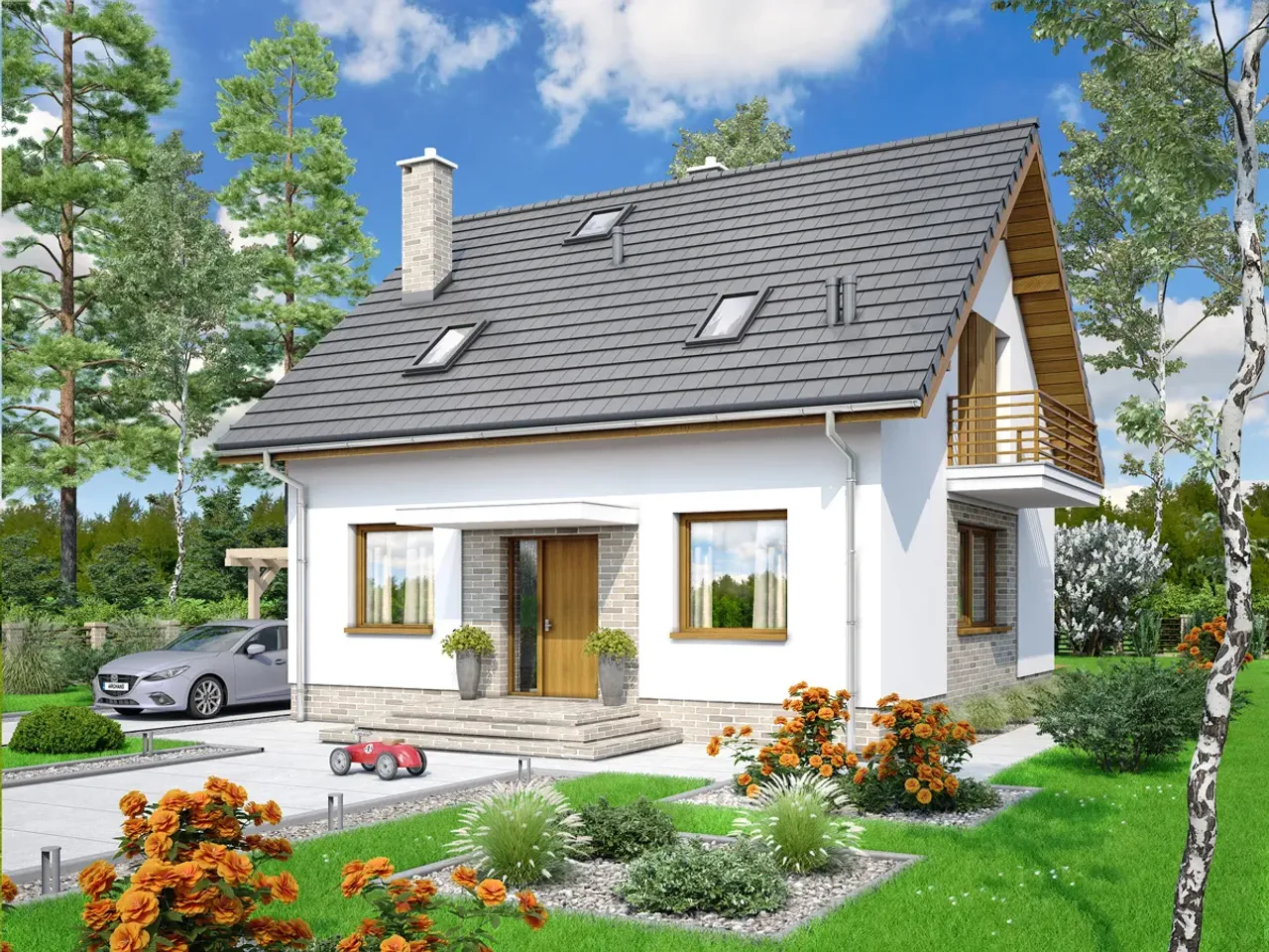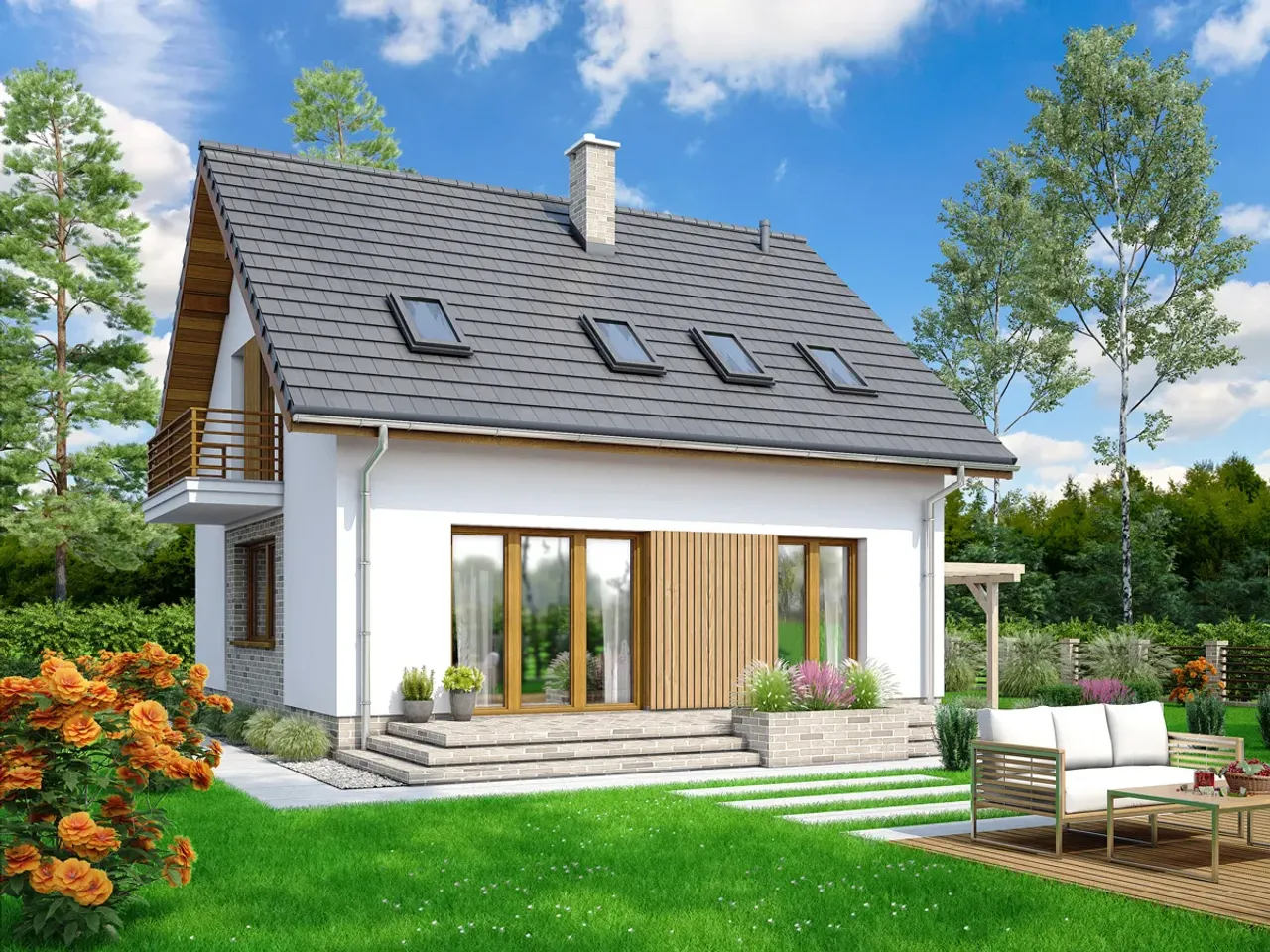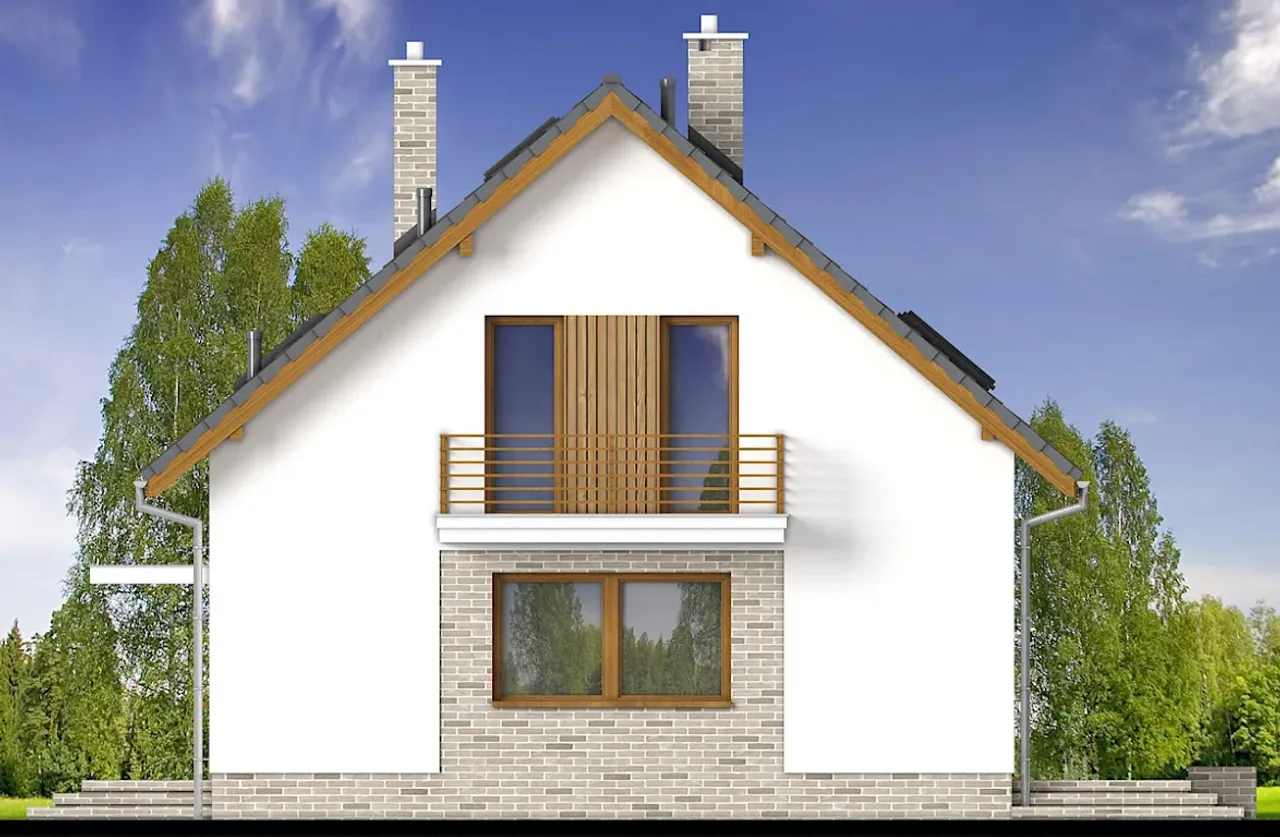 Dom pozbawiony garażu sprawdza się znakomicie na mniejszych działkach, a jednocześnie oferuje przytulną, funkcjonalną przestrzeń. Drewniana konstrukcja dachu z eleganckim pokryciem z dachówki betonowej lub ceramicznej nadaje bryle charakteru i wytrzymałości. Ciepły kominek w projekcie sprzyja wspólnym chwilom w gronie bliskich, budując niezapomnianą atmosferę szczególnie w jesienno-zimowe wieczory.