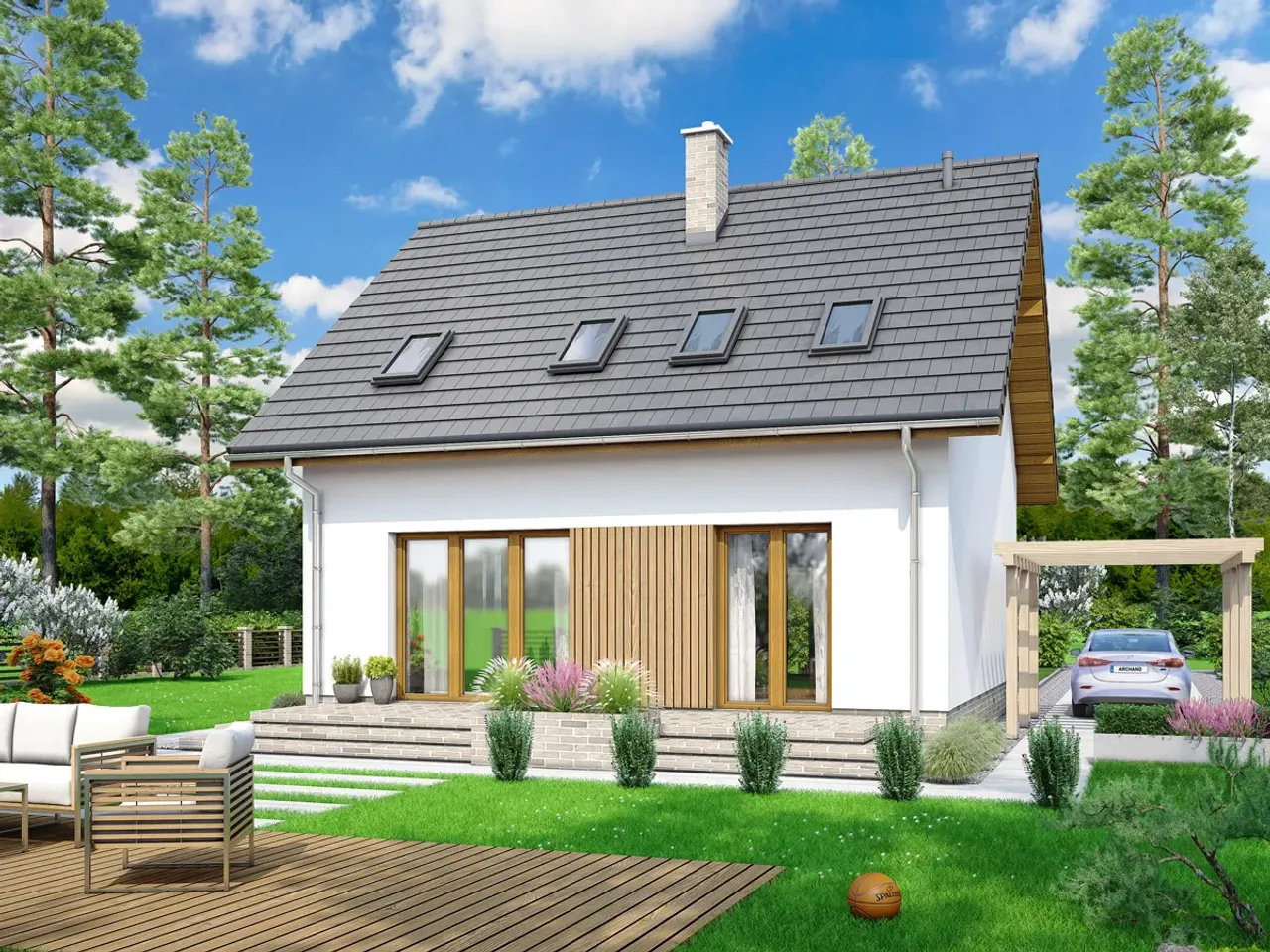 Dom oparty na projekcie Lungo 5 to propozycja dla inwestorów szukających współczesnej architektury, która zachwyca prostotą i elegancją. Parterowy układ z poddaszem sprawia, że dom jest doskonale przystosowany do codziennego życia nawet liczniejszej rodziny. Przemyślany rozkład pięciu pokoi pozwala oddzielić strefę dzienną od części prywatnej, a szerokie wyjście na taras otwiera przestrzeń na relaks blisko natury.