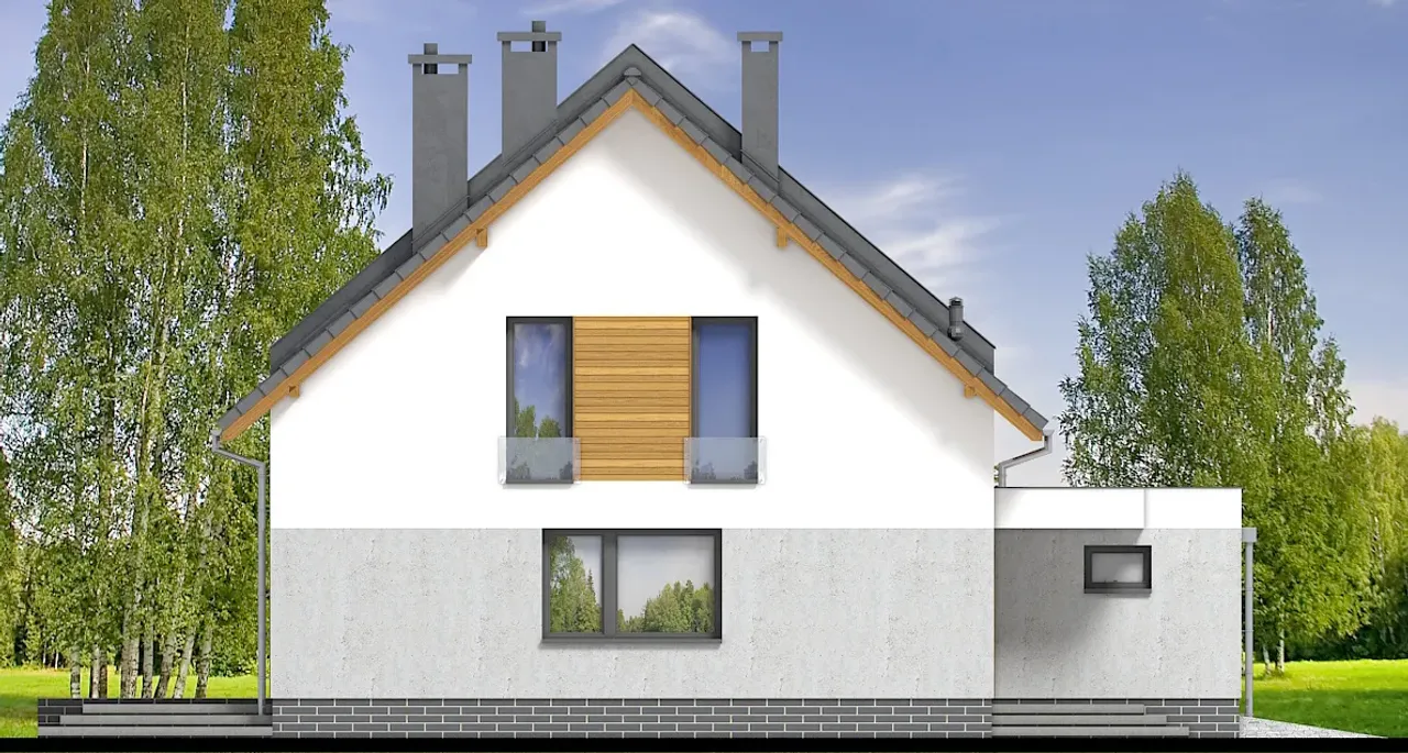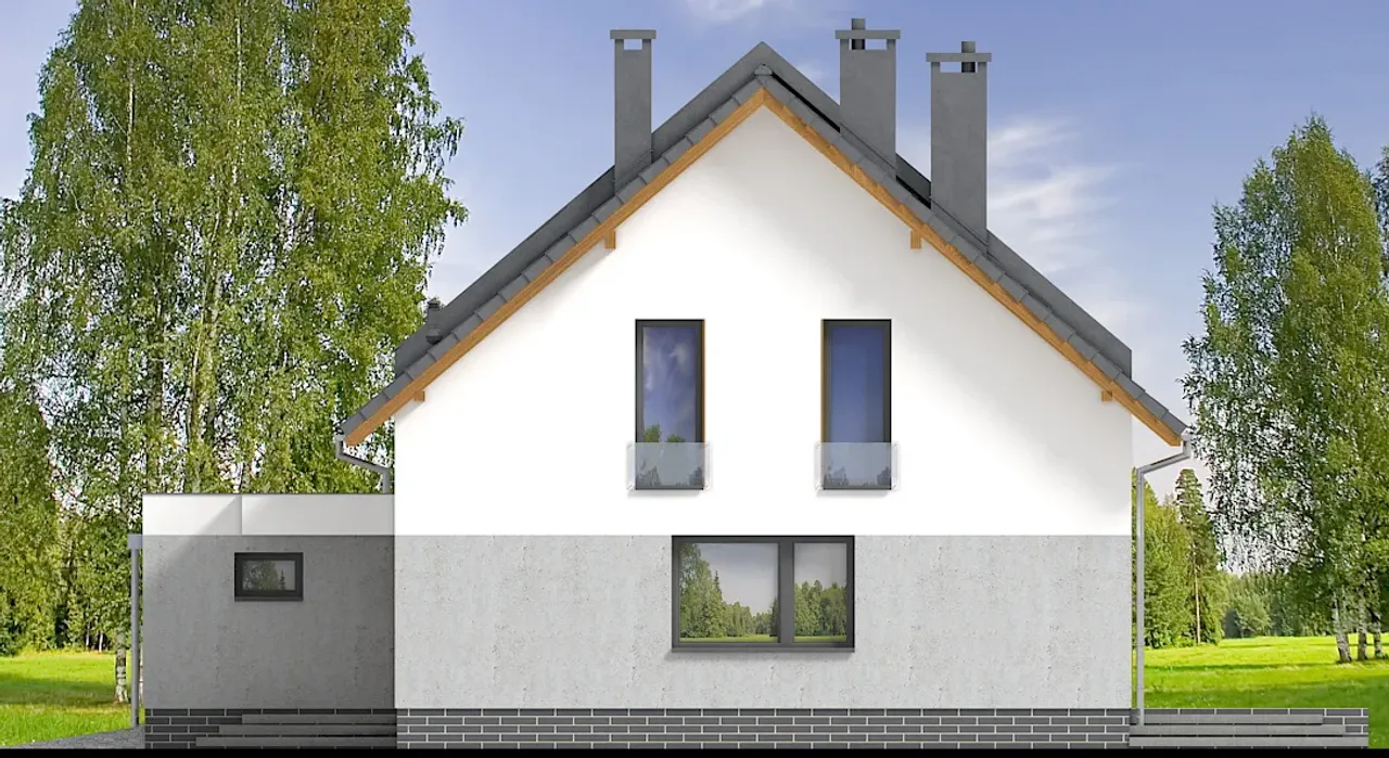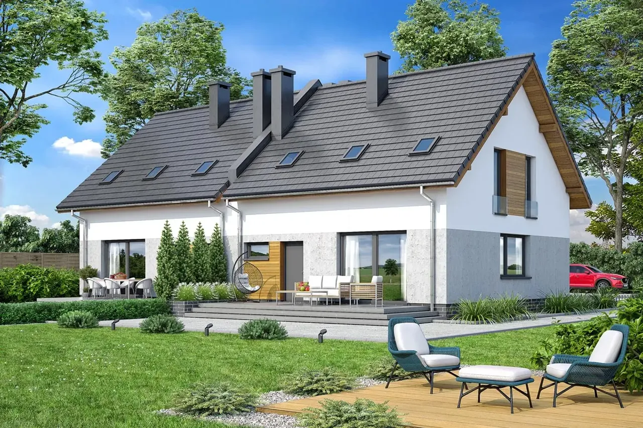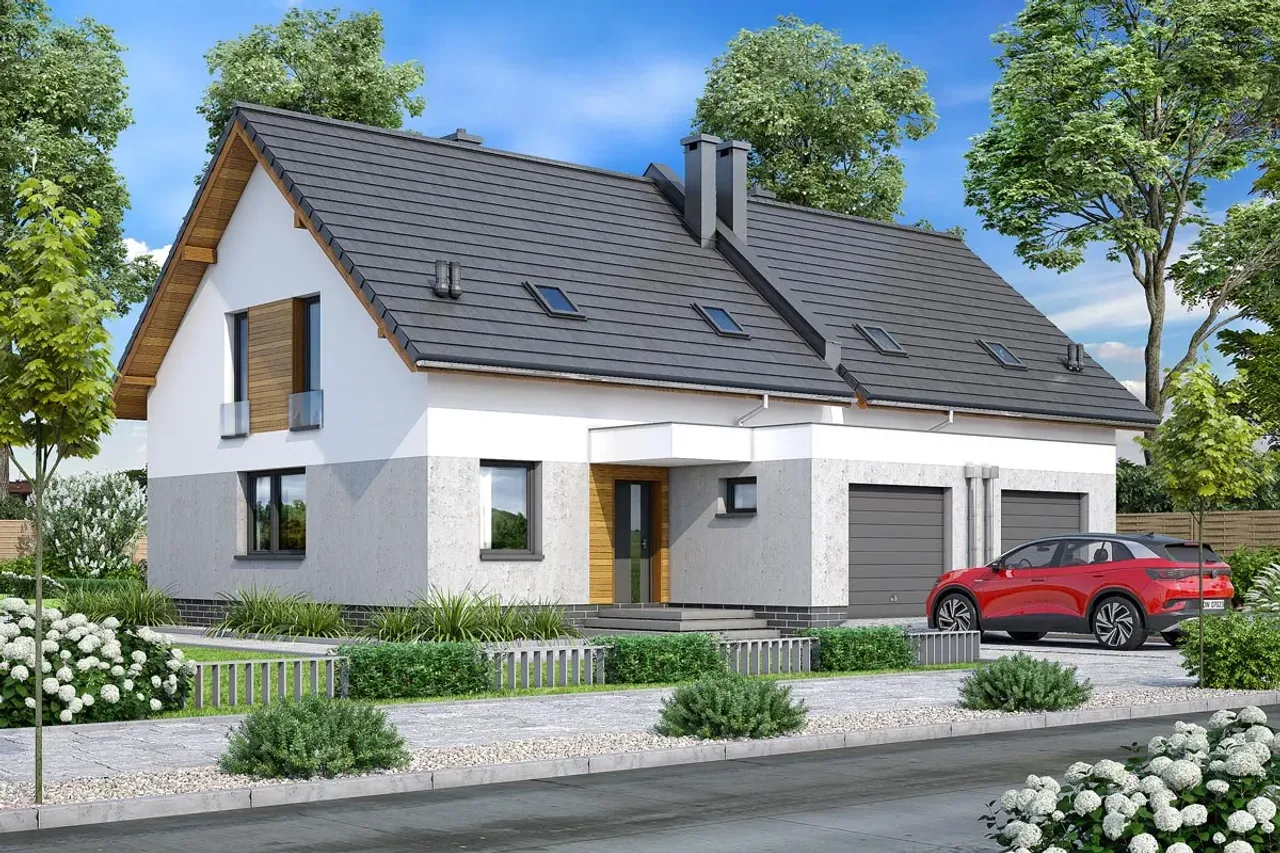 Drewniana konstrukcja dachu pokryta trwałą dachówką ceramiczną lub betonową podkreśla ponadczasowy wygląd budynku, a jednocześnie jest odporna na czynniki atmosferyczne. Praktyczny garaż z bezpośrednim wejściem do domu ułatwia codzienność - koniec z przemoczeniem w deszczu. Obszerne pomieszczenia z czterema pokojami zapewnią wygodę nawet liczniejszej rodzinie, a poddasze do swobodnej aranżacji pozwala dopasować przestrzeń do własnych potrzeb.