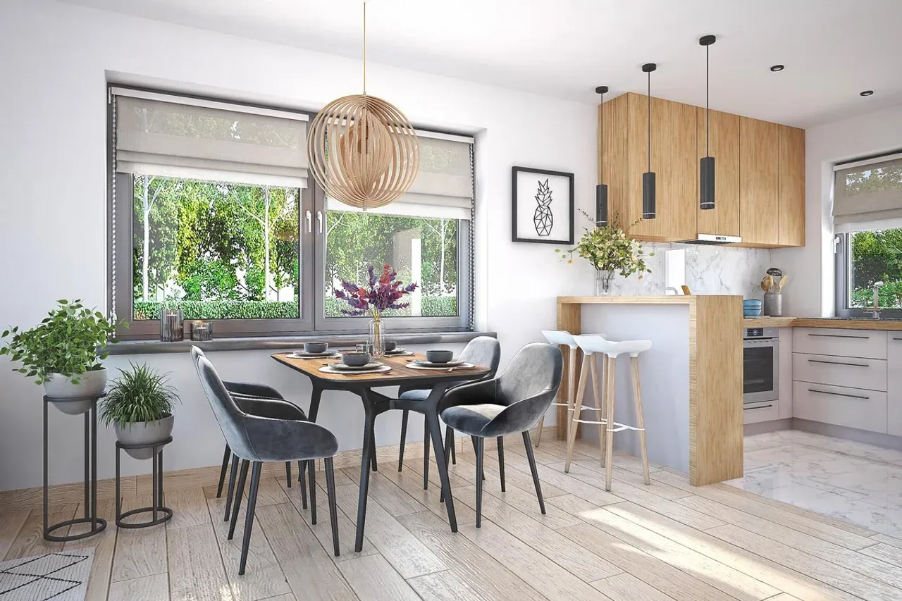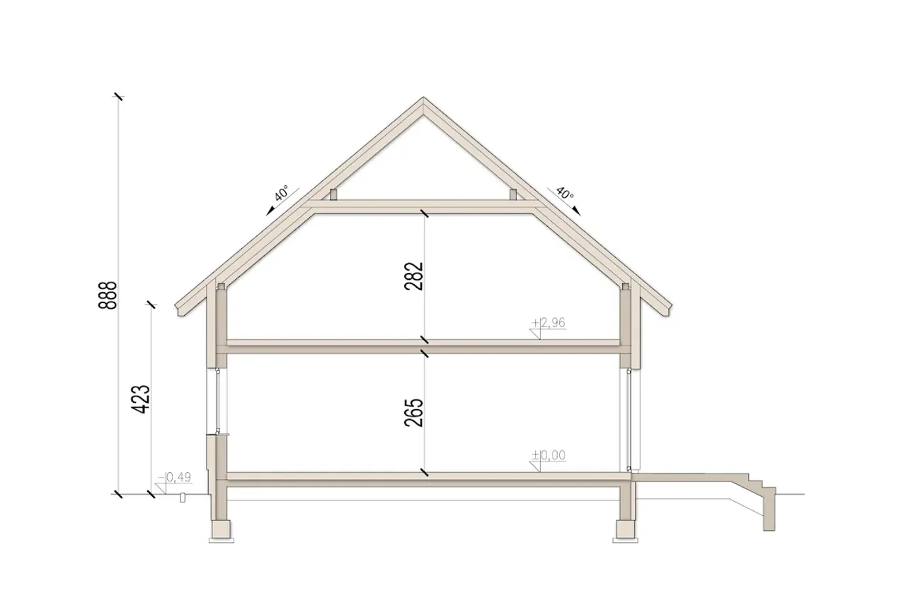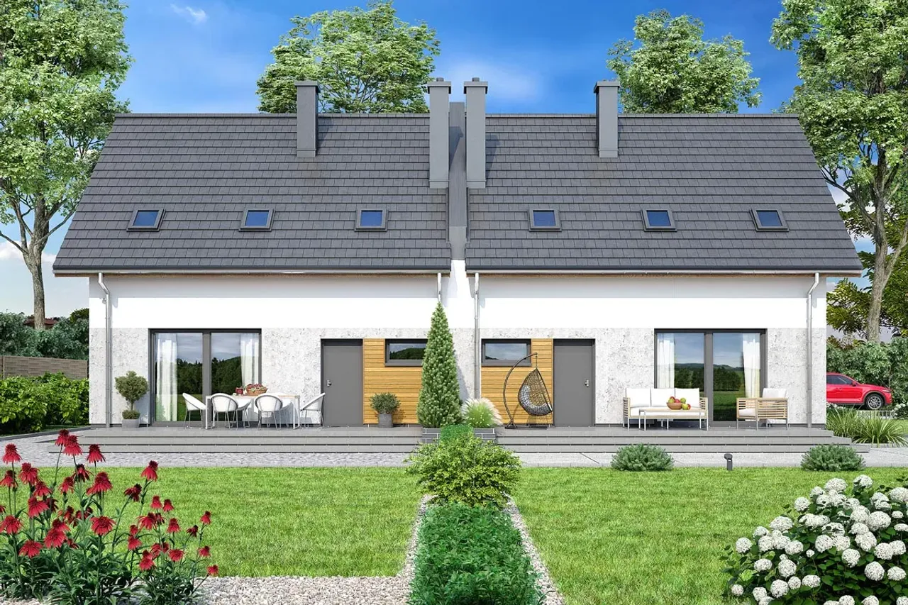 Drewniana konstrukcja dachu pokryta trwałą dachówką ceramiczną lub betonową podkreśla ponadczasowy wygląd budynku, a jednocześnie jest odporna na czynniki atmosferyczne. Praktyczny garaż z bezpośrednim wejściem do domu ułatwia codzienność - koniec z przemoczeniem w deszczu. Obszerne pomieszczenia z czterema pokojami zapewnią wygodę nawet liczniejszej rodzinie, a poddasze do swobodnej aranżacji pozwala dopasować przestrzeń do własnych potrzeb.