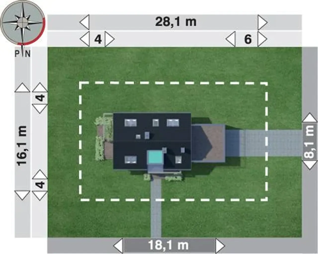- rzut dachu - ukazuje jego kształt, wymiary, kąt nachylenia połaci, rozmieszczenie okien połaciowych, lukarn, świetlików i rur spustowych, pokazuje rozmieszczenie kominów i informuje o sposobie odwodnienia: rozmieszczeniu i rozmiarach rynien