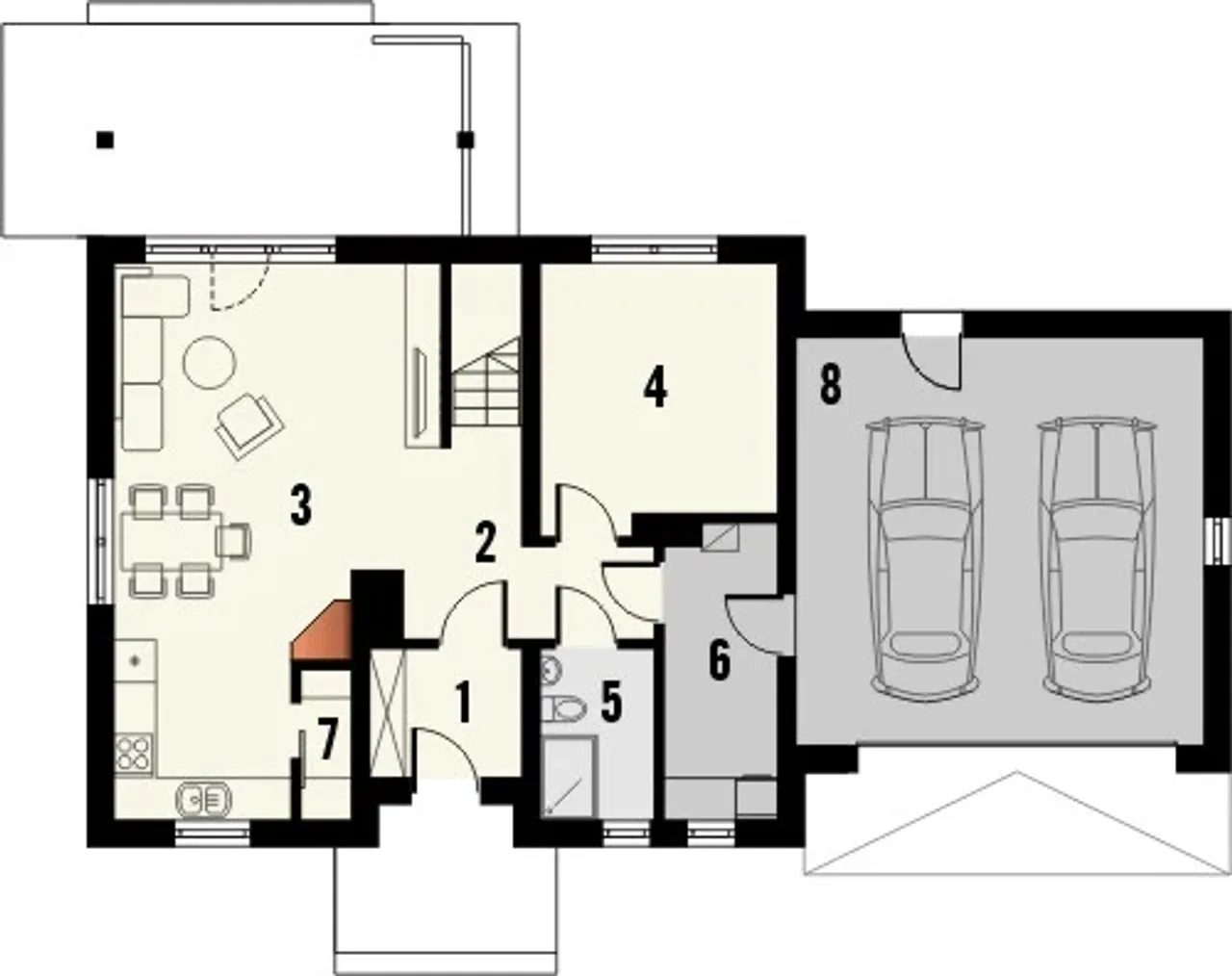 Gotowy projekt MADRAS_2G to budynek piętrowy o prostej bryle w technologii murowanej. Budynek zaprojektowany został w stylu tradycyjnym z dachem dwuspadowym. W projekcie nie przewidziano podpiwniczenia. Do budynku przynależy garaż 2 stanowiskowy. W projekcie nie przewidziano pomieszczenia na garderobę. W pobliżu pomieszczenia kuchennego znajduje się spiżarnia. W przestronnym salonie znajduje się kominek.