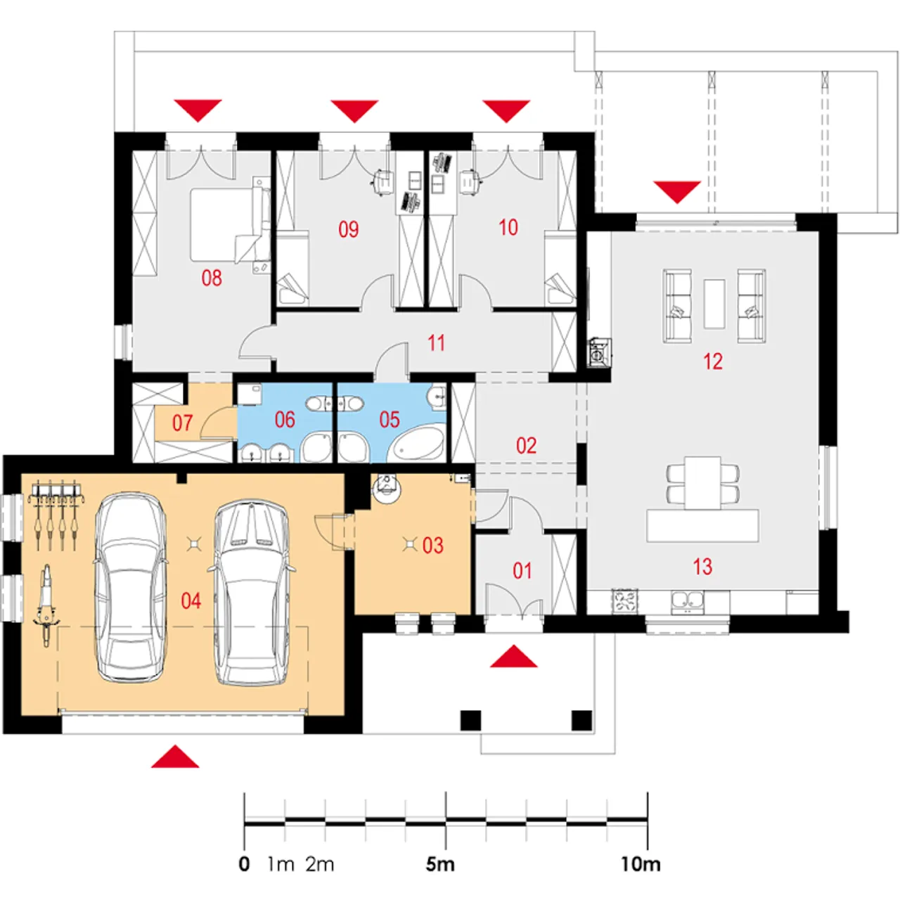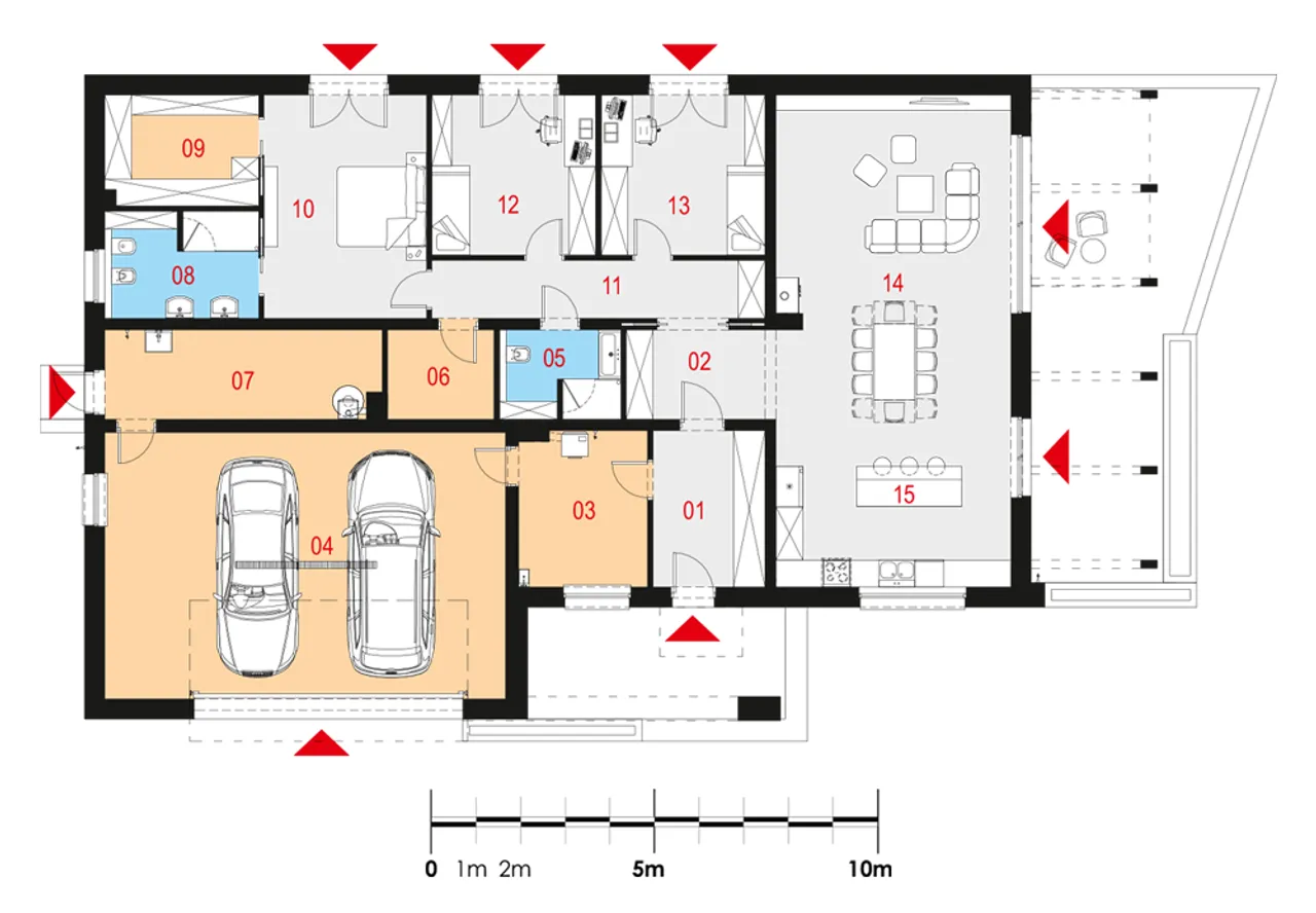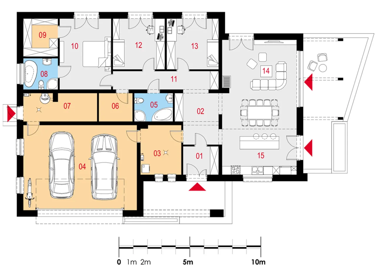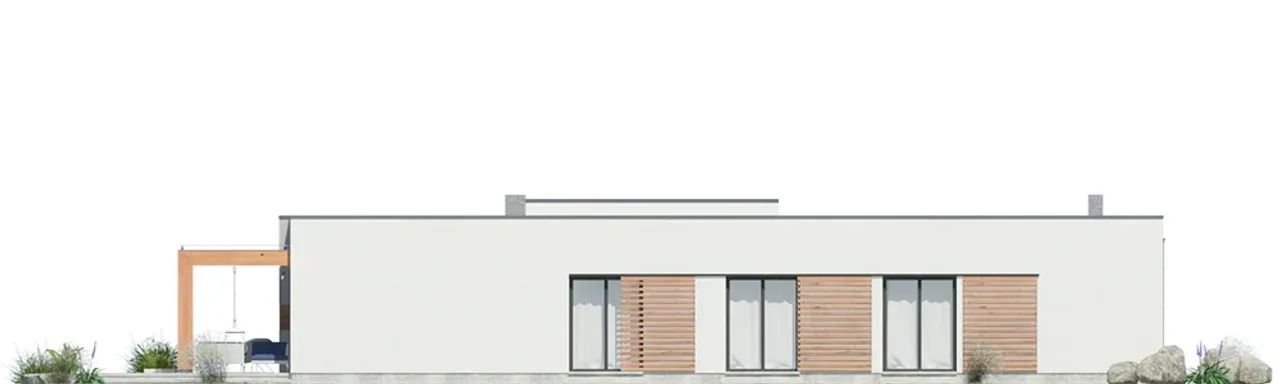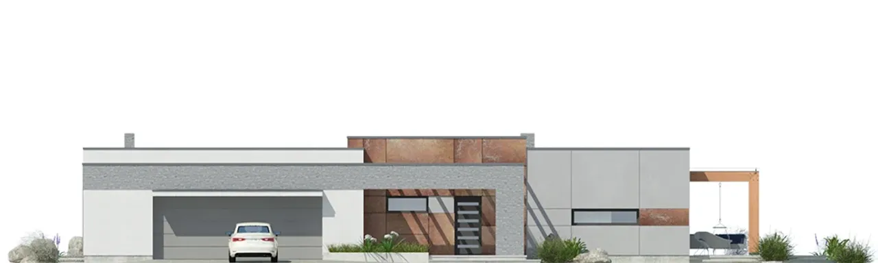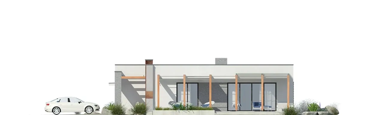 Garaż dwustanowiskowy zlokalizowany z przodu budynku, atrakcyjny taras z designerskim zadaszeniem oraz przemyślany układ pomieszczeń wyróżniają projekt Magneticus IV G2 na tle innych parterowych domów. Szereg praktycznych udogodnień, takich jak dwa niezależne wejścia i duża kotłownia, zapewniają domownikom swobodę działania każdego dnia.