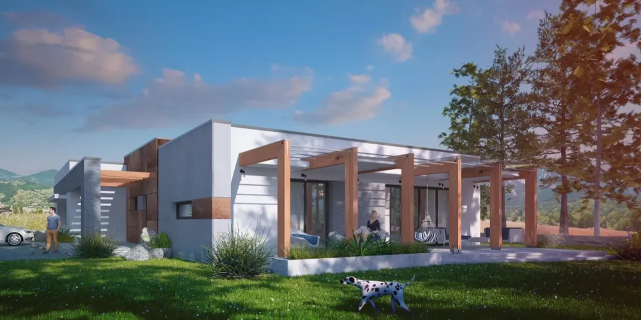 Ściany zewnętrzne wykonane z bloczków komórkowych i skuteczna izolacja styropianem sprawiają, że dom oszczędza energię i pozostaje przytulny nawet w chłodne dni. Stropodach gęstożebrowy pokryty membraną to trwałe, estetyczne rozwiązanie bez kompromisów. Zadaszony taras z pergolą ze stałymi żaluzjami i szklanym dachem pozwala relaksować się niezależnie od pogody, w otoczeniu natury i zapachu drewna.