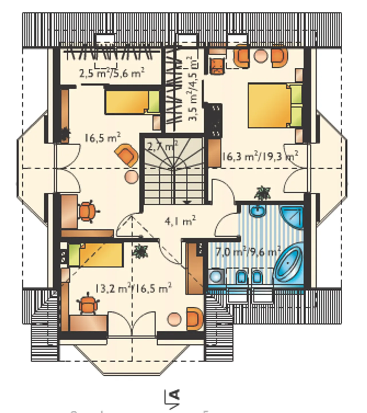 - rzut dachu - ukazuje jego kształt, wymiary, kąt nachylenia połaci, rozmieszczenie okien połaciowych, lukarn, świetlików i rur spustowych, pokazuje rozmieszczenie kominów i informuje o sposobie odwodnienia: rozmieszczeniu i rozmiarach rynien