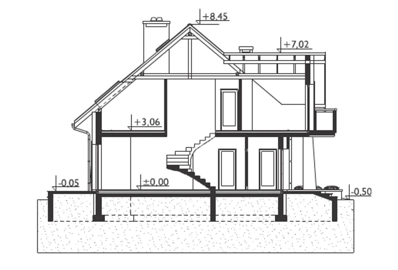 - przekroje - pokazują wszystkie elementy budynku po przecięciu go wzdłuż lub w poprzek od dachu do fundamentów tj. warstwy podłogi, stropów i dachu
