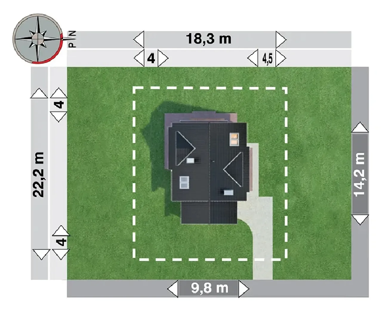 - rzut dachu - ukazuje jego kształt, wymiary, kąt nachylenia połaci, rozmieszczenie okien połaciowych, lukarn, świetlików i rur spustowych, pokazuje rozmieszczenie kominów i informuje o sposobie odwodnienia: rozmieszczeniu i rozmiarach rynien