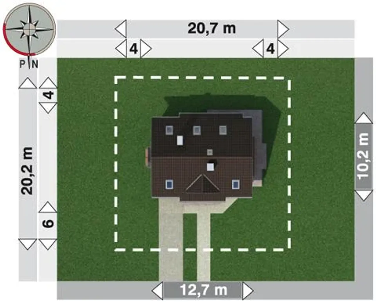 - rzut dachu - ukazuje jego kształt, wymiary, kąt nachylenia połaci, rozmieszczenie okien połaciowych, lukarn, świetlików i rur spustowych, pokazuje rozmieszczenie kominów i informuje o sposobie odwodnienia: rozmieszczeniu i rozmiarach rynien