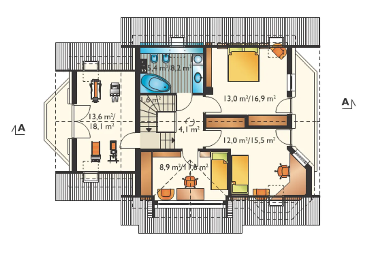 - rzut dachu - ukazuje jego kształt, wymiary, kąt nachylenia połaci, rozmieszczenie okien połaciowych, lukarn, świetlików i rur spustowych, pokazuje rozmieszczenie kominów i informuje o sposobie odwodnienia: rozmieszczeniu i rozmiarach rynien