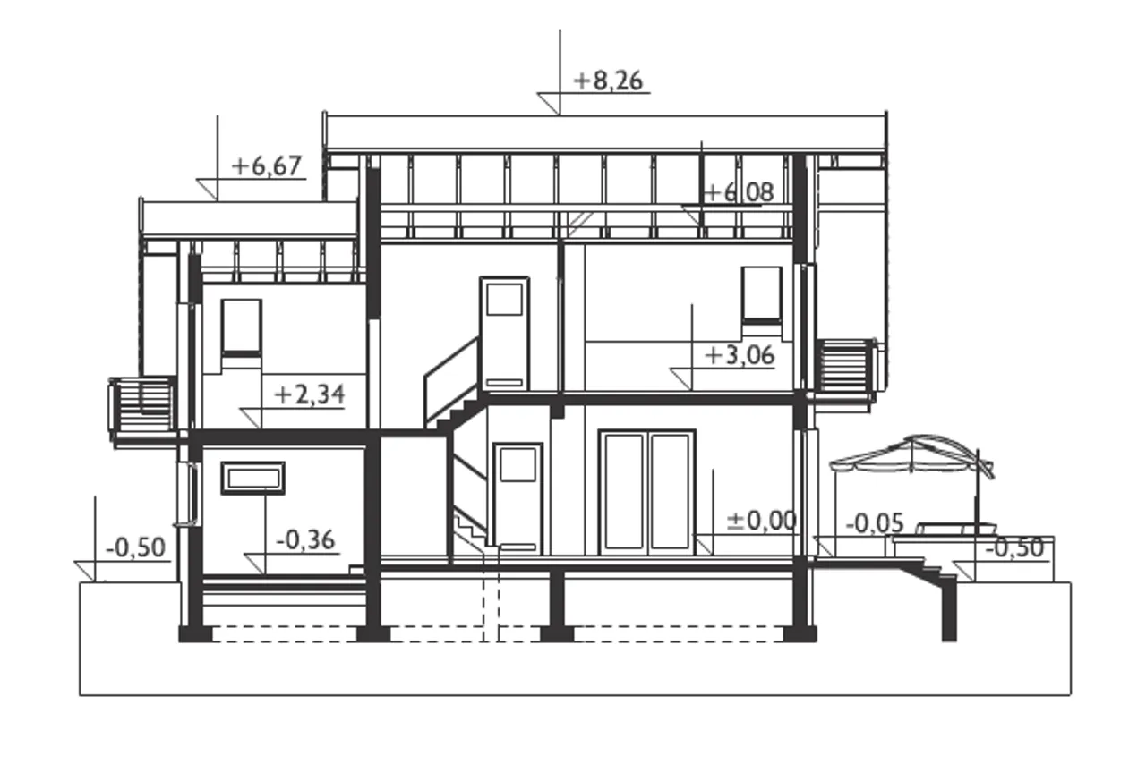 - przekroje - pokazują wszystkie elementy budynku po przecięciu go wzdłuż lub w poprzek od dachu do fundamentów tj. warstwy podłogi, stropów i dachu