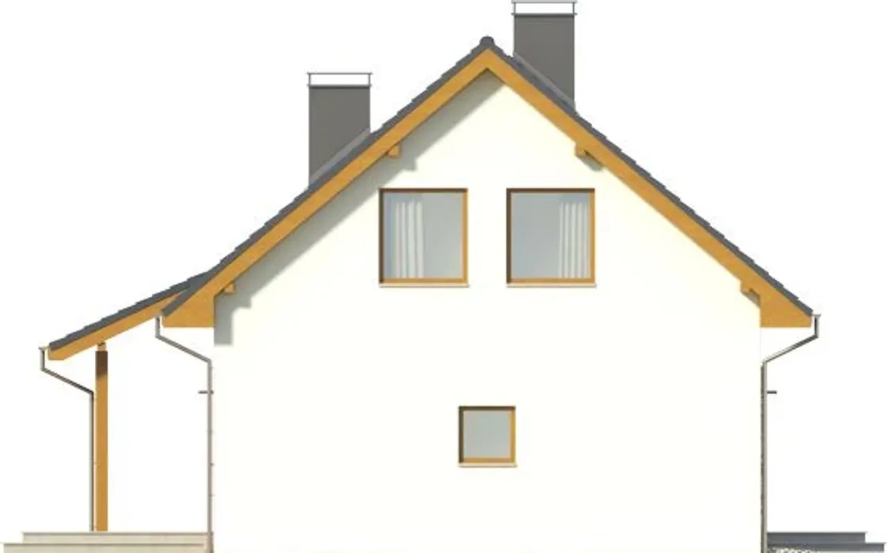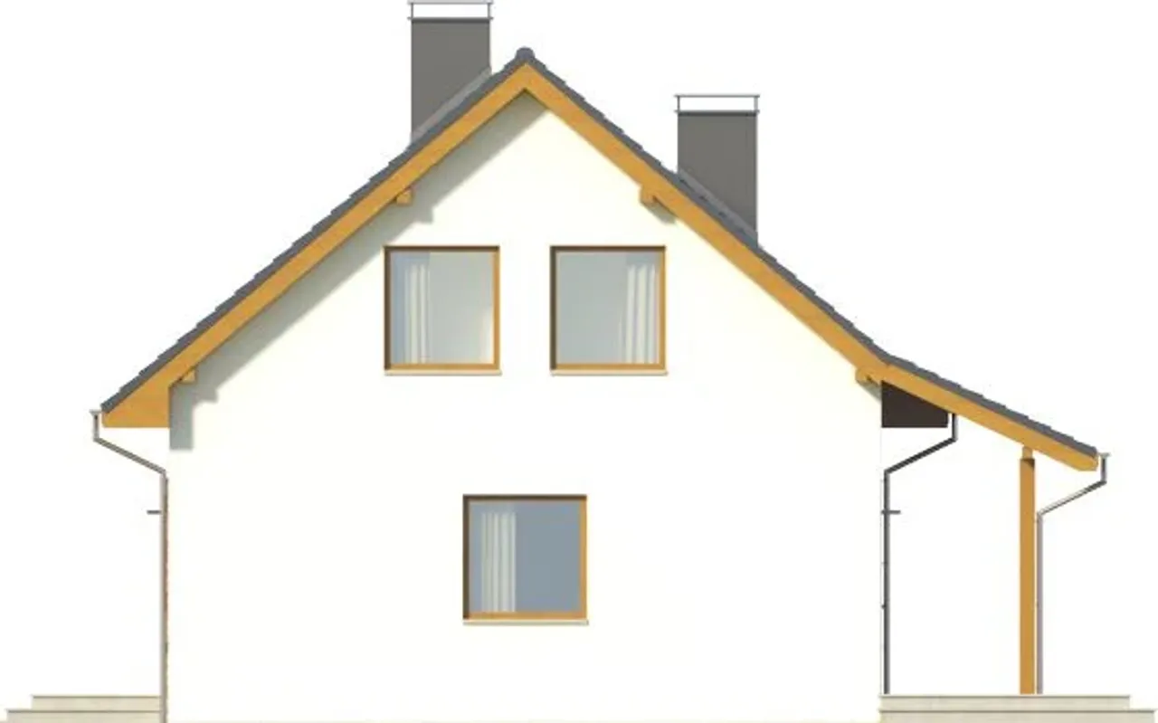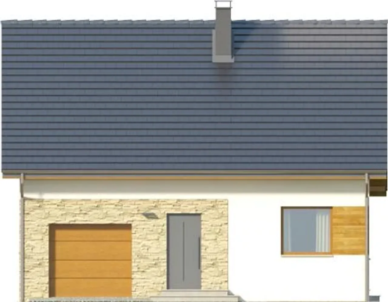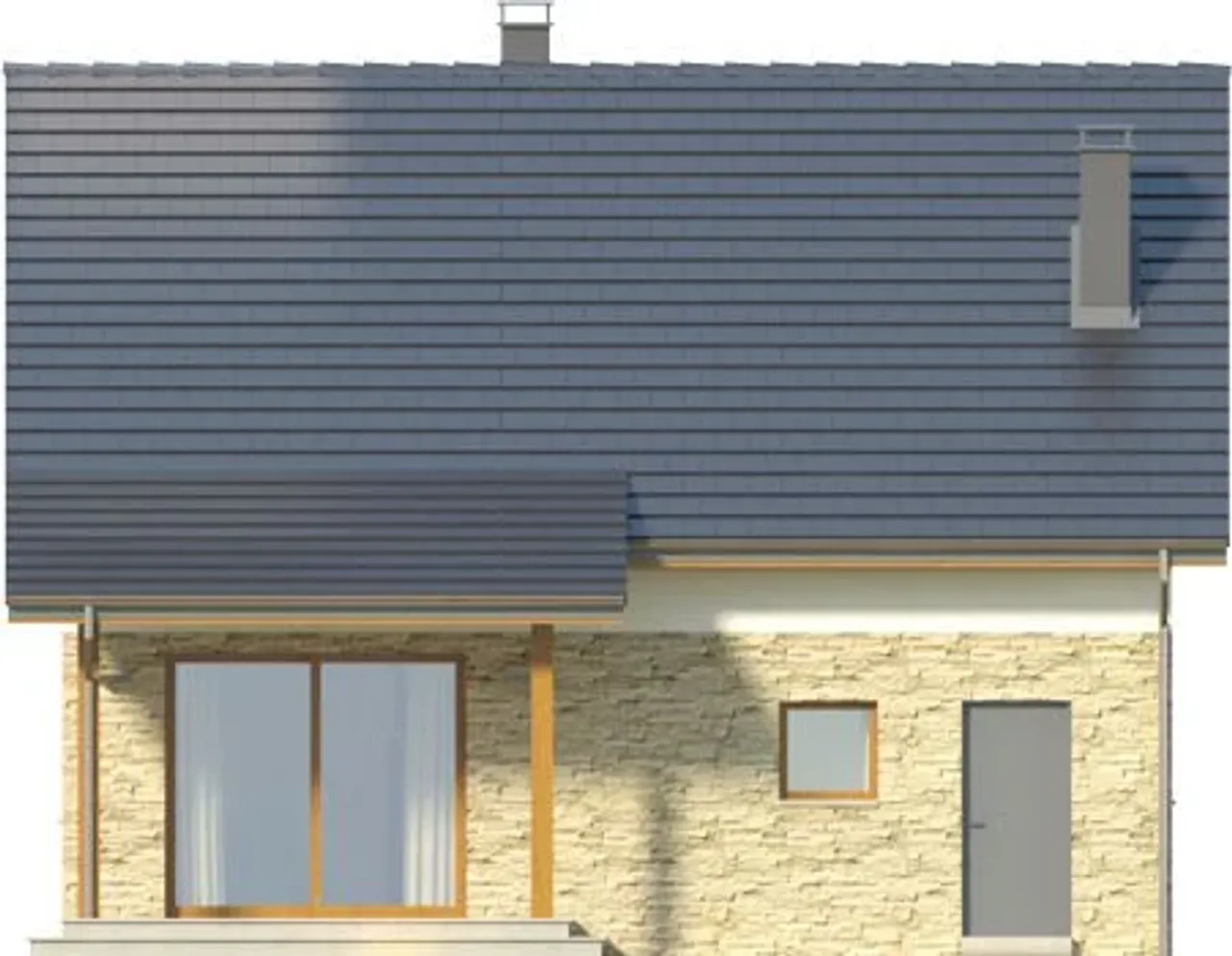 Majówka to kompaktowy dom jednorodzinny, który posiada jednostanowiskowy garaż w obrębie budynku. jego cechą charakterystyczną jest poddasze użytkowe pod stromym dachem. część połaci dachowej z tyłu domu została wydłużona, tworząc funkcjonalne zadaszenie nad tarasem. elewacja frontowa i tylna ozdobiona jest płytkami kamiennymi, co dodaje estetycznego wyglądu całości.