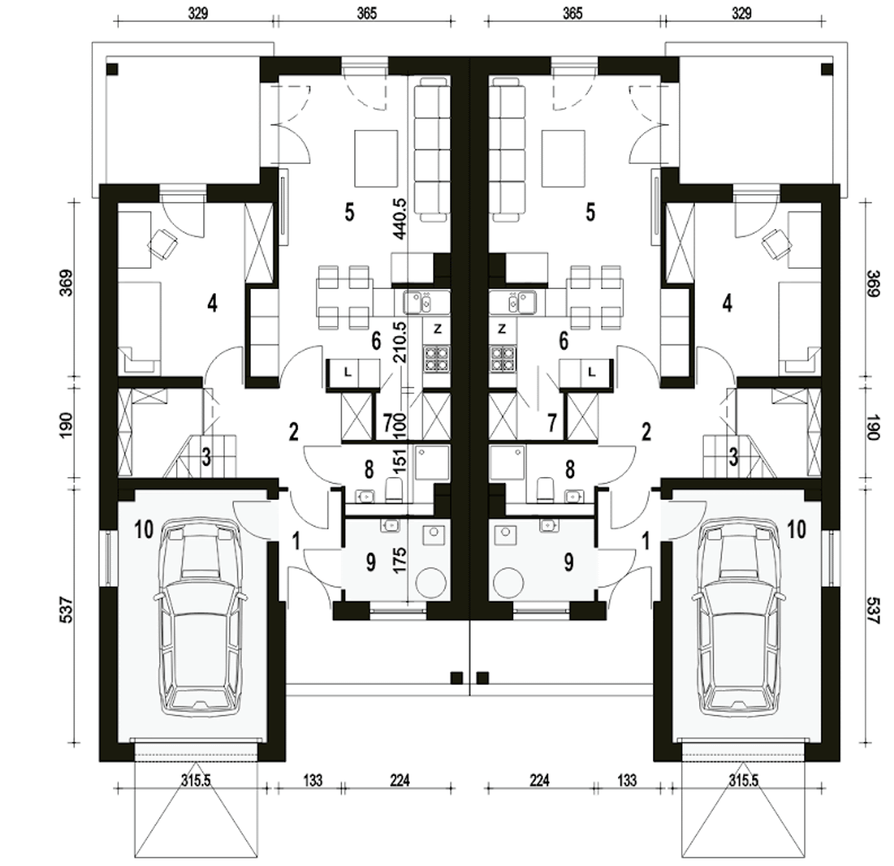 Wypełnij formularz i otrzymaj rysunki w pdf z dokładnymi wymiarami budynku i pomieszczeń (długość, szerokość, wysokość) dla projektu Makolągwa z garażem 1-st. bliźniak A-BL2