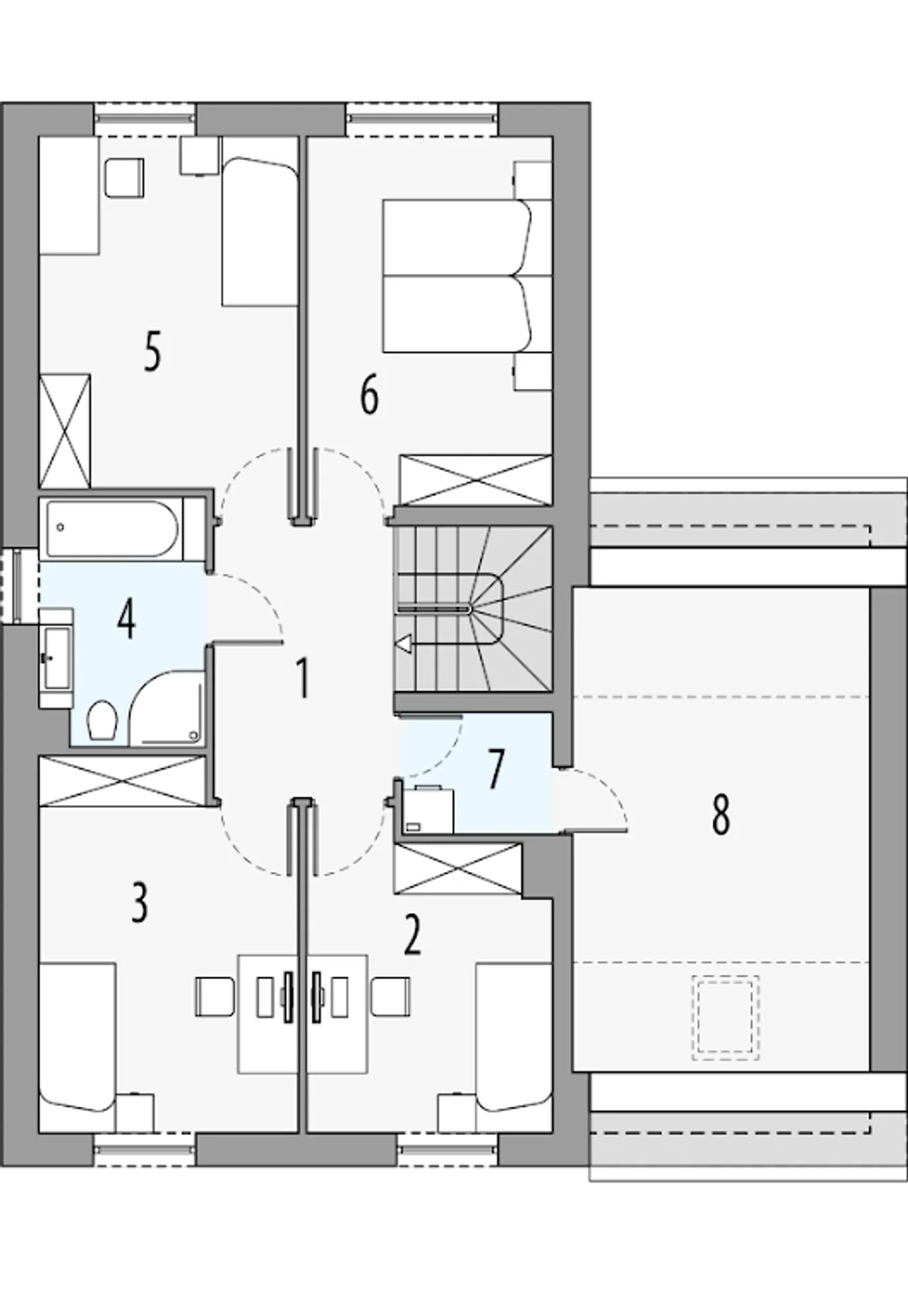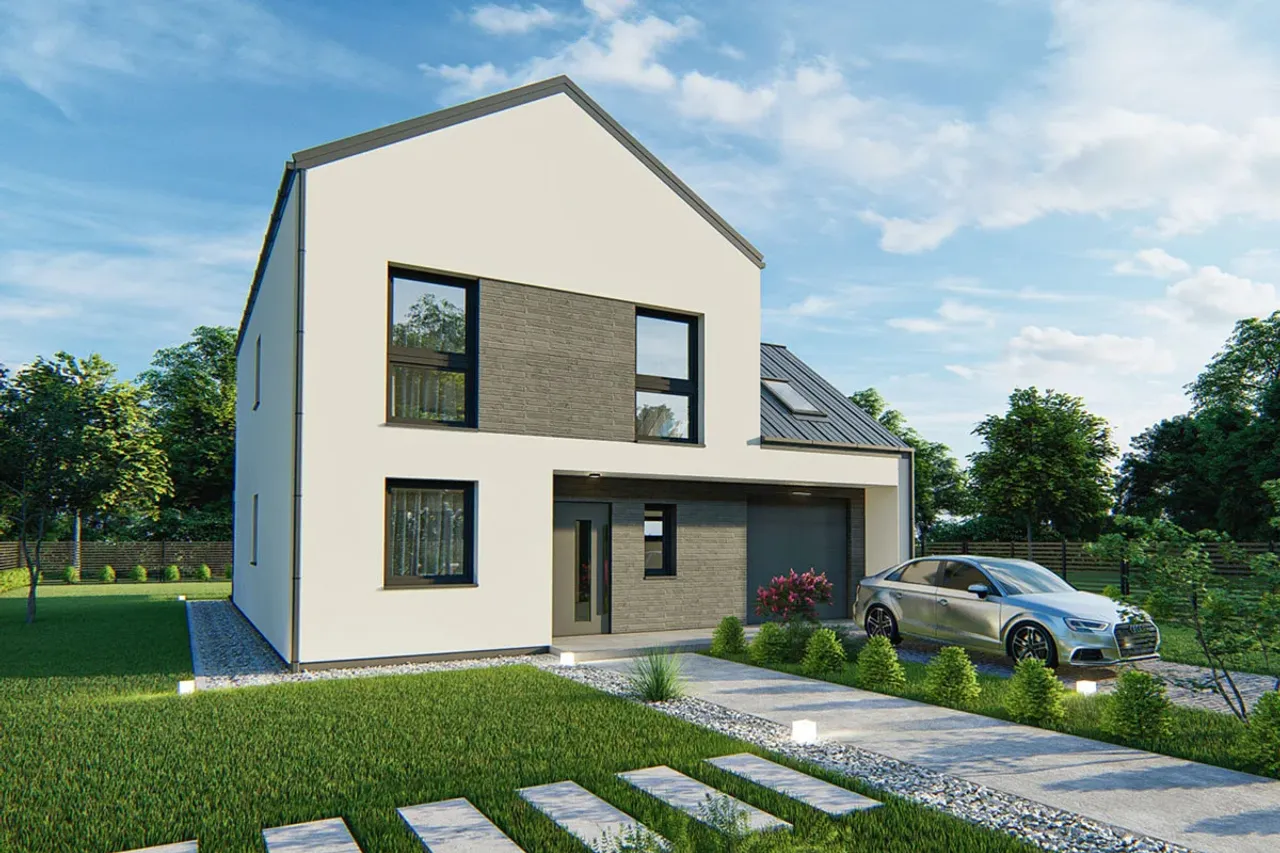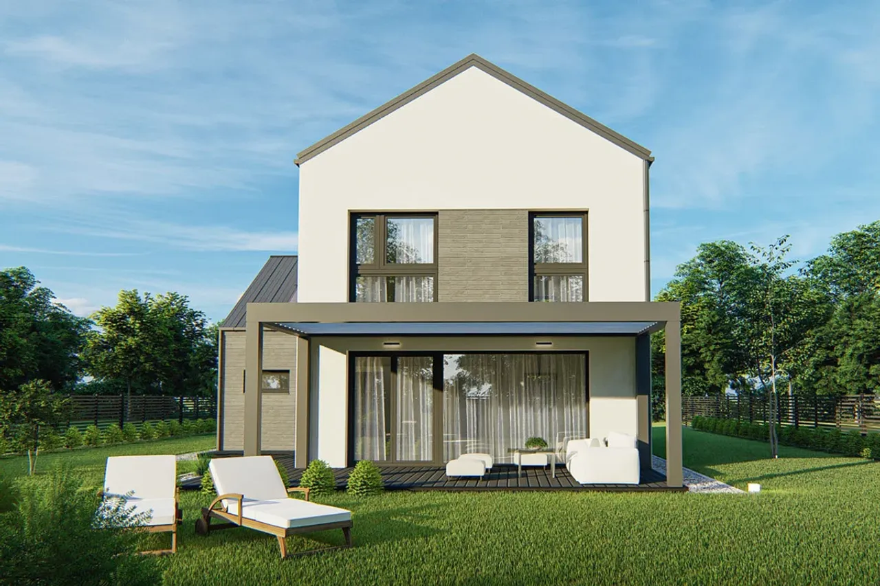 Projekt domu Malena Horyzont prezentuje się jako atrakcyjne rozwiązanie dla osób poszukujących nowoczesnych, ale jednocześnie funkcjonalnych i przemyślanych przestrzeni mieszkalnych. Architektura tego modelu łączy w sobie elementy nowoczesności z potrzebami typowej rodziny, oferując praktyczne rozwiązania takie jak wydzielona strefa dzienna i nocna, co z pewnością zwiększa komfort użytkowania. Dodatkowo, zastosowanie dużych przeszkleń może wpływać na lepsze doświetlenie wnętrz, co jest istotnym aspektem podczas wyboru projektu domu. Projekt ten może być również atrakcyjny ze względu na swoją stylistykę, która łączy ciepło i przytulność domowego ogniska z nowoczesnym designem.