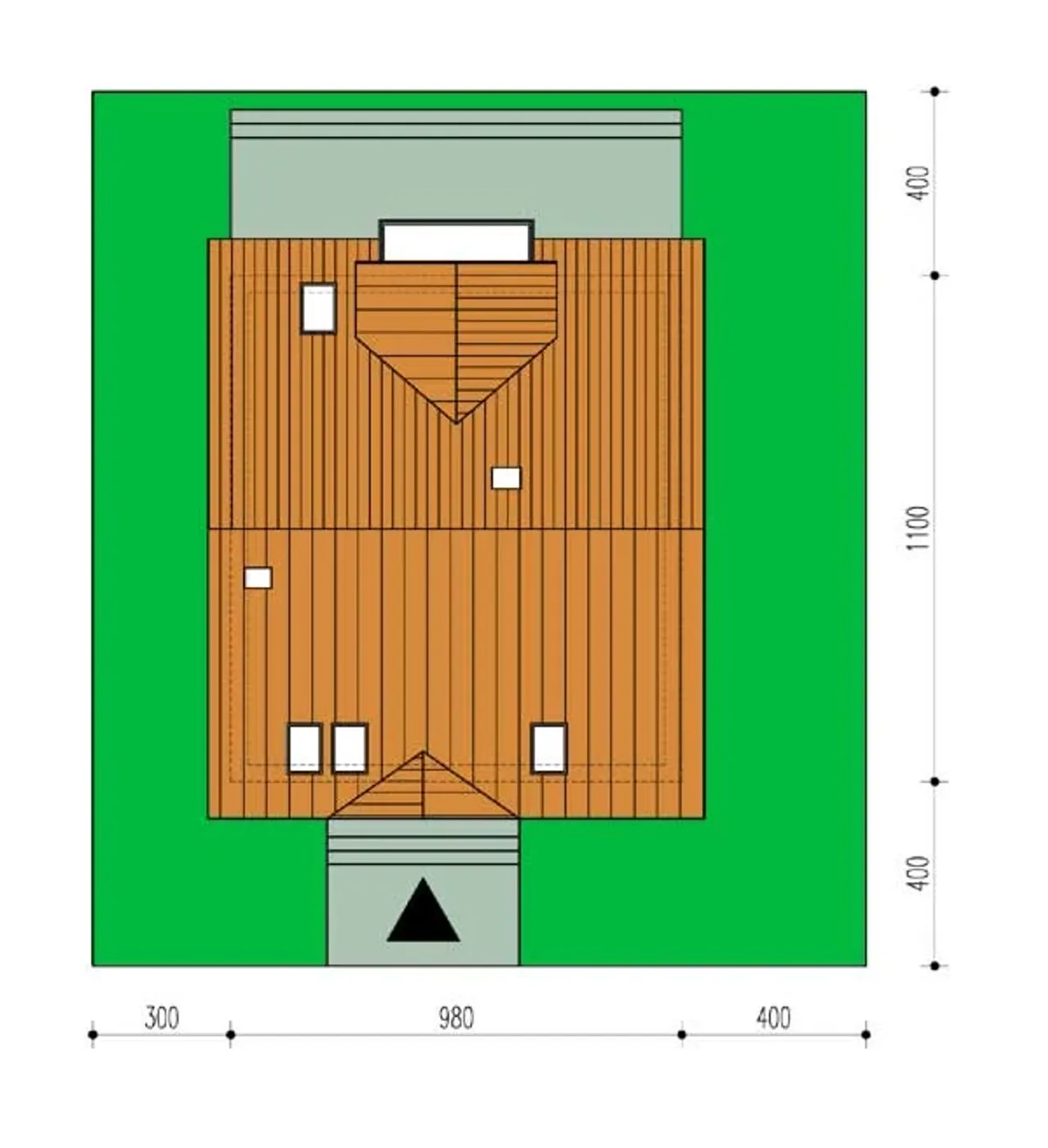 4. Rzut dachu – dokładnie zwymiarowany pokazujący kształt dachu i jego kąt nachylenia ,rozmieszczenie okien połaciowych, lukarn oraz rur spustowych.