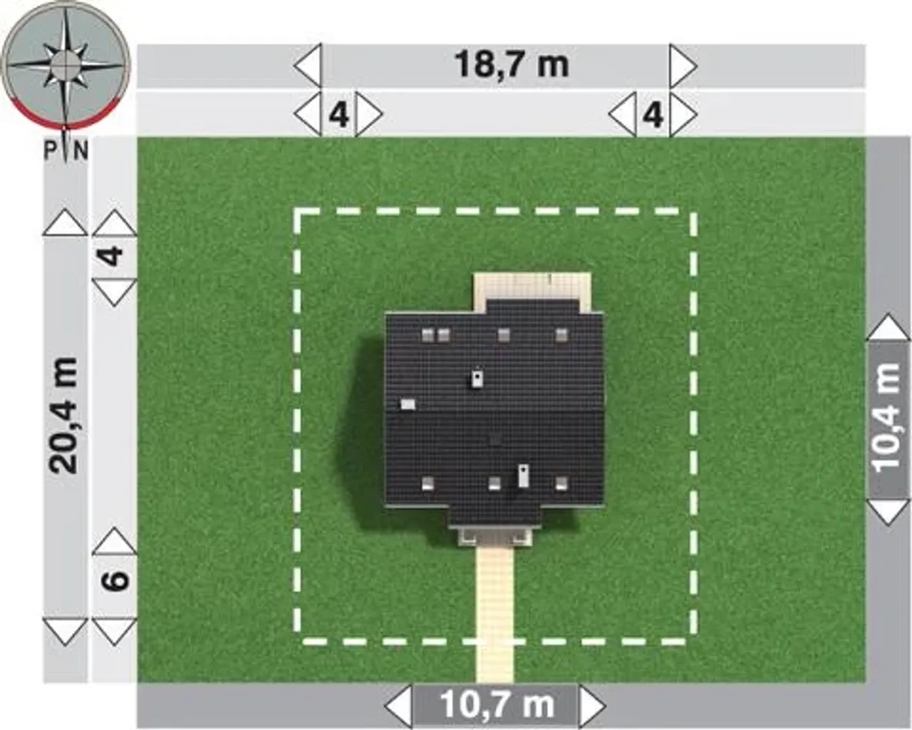 - rzut dachu - ukazuje jego kształt, wymiary, kąt nachylenia połaci, rozmieszczenie okien połaciowych, lukarn, świetlików i rur spustowych, pokazuje rozmieszczenie kominów i informuje o sposobie odwodnienia: rozmieszczeniu i rozmiarach rynien