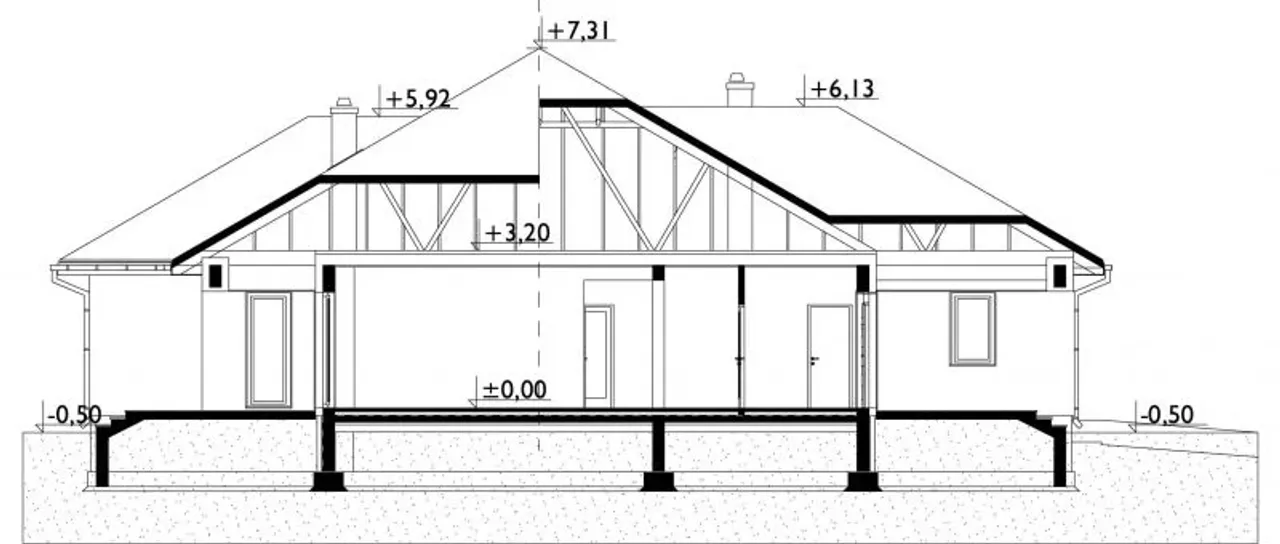 - rzut dachu - ukazuje jego kształt, wymiary, kąt nachylenia połaci, rozmieszczenie okien połaciowych, lukarn, świetlików i rur spustowych, pokazuje rozmieszczenie kominów i informuje o sposobie odwodnienia: rozmieszczeniu i rozmiarach rynien