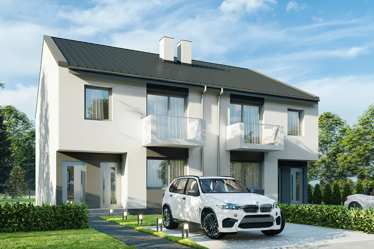 Projekt domu Merlin 1 - bliźniak zachwyca przemyślaną architekturą, która idealnie wpisuje się w potrzeby współczesnych rodzin ceniących sobie zarówno komfort, jak i elegancję. Harmonijne połączenie nowoczesności z funkcjonalnością sprawia, że każdy metr kwadratowy został wykorzystany w optymalny sposób, oferując przestronność oraz intymność. Piękno tego projektu podkreślają duże przeszklenia, które nie tylko rozjaśniają wnętrze, ale też umożliwiają piękny widok na otoczenie, co każdego dnia potrafi napełnić dom ciepłem i pozytywną energią. Szczególnie urokliwy układ pomieszczeń pozwala na łatwe oddzielenie strefy dziennej od nocnej, co jest idealne dla rodziny potrzebującej zarówno przestrzeni wspólnych, jak i prywatnych zakątków. Projekt Merlin 1 wspaniale łączy w sobie klasykę z nowoczesnością, co czyni go atrakcyjnym wyborem dla każdego, kto marzy o eleganckim, ale ciepłym domu.