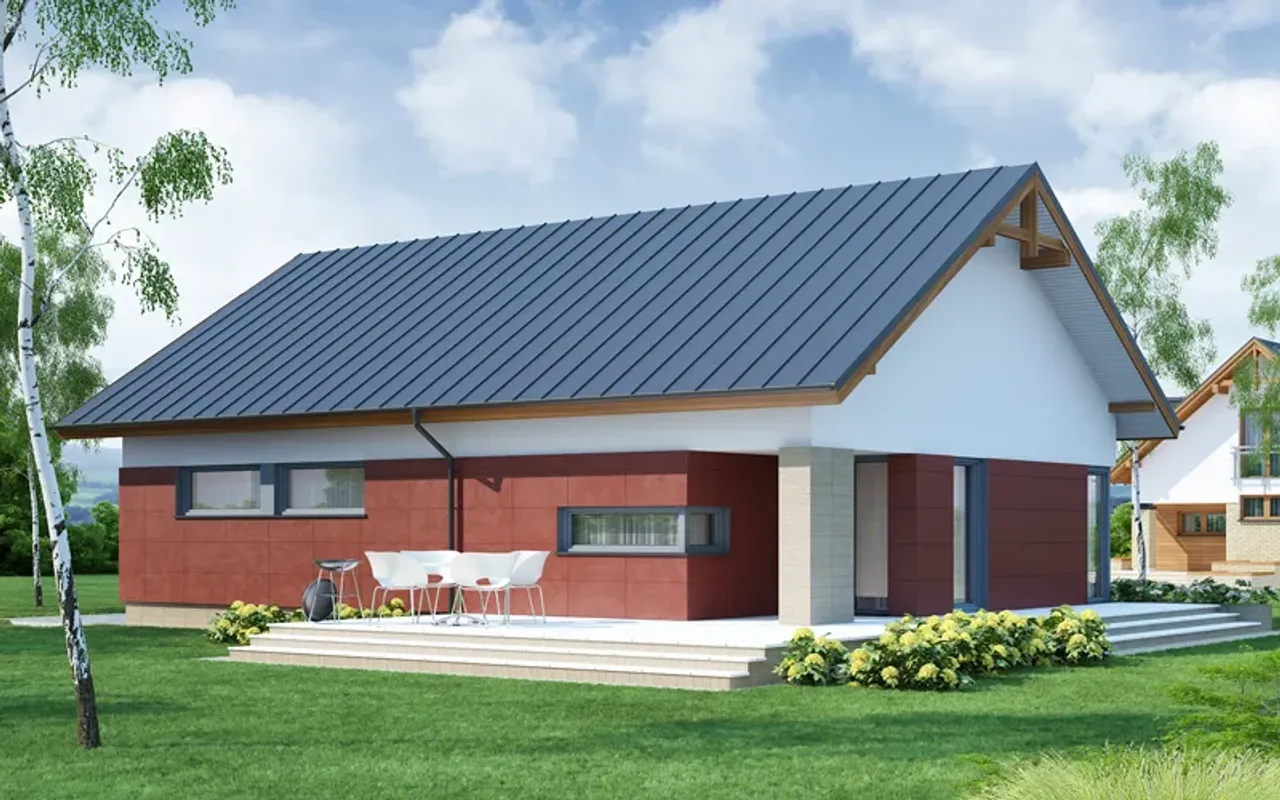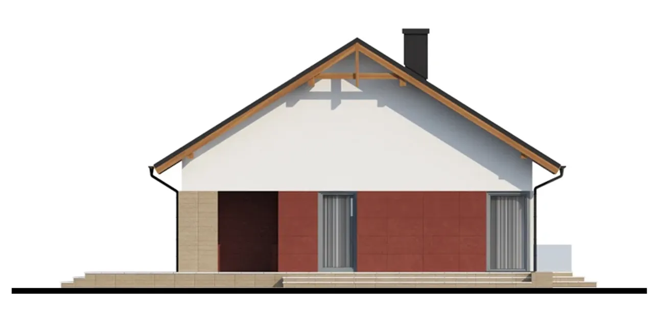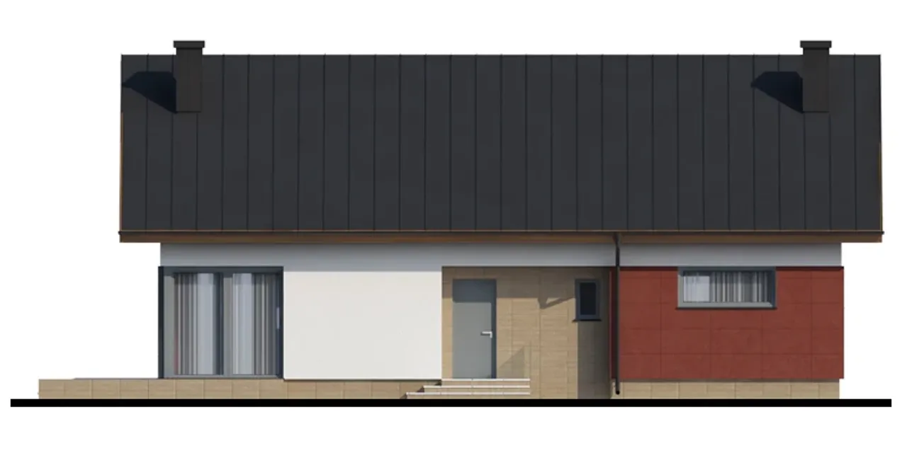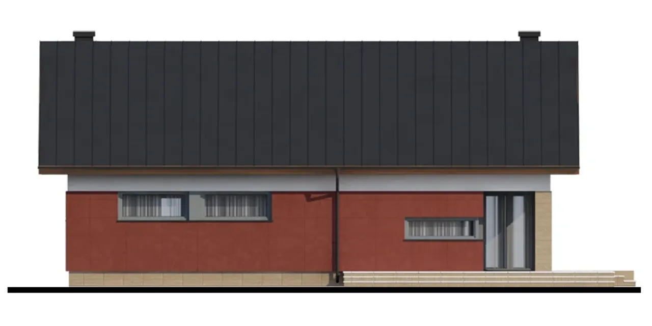 Projekt domu Midas 3 to parterowy dom pokryty dachem dwuspadowym. Budynek posiada proste kształty oraz nowoczesny wygląd, dzięki niewielkim gabarytom budynek bez problemu może zostać usytułowany na mniejszych działkach. Od strony frontowej budynku znajdują się drzwi wejściowe, które zostały delikatnie wcięte w bryłę budynku. Projekt domu Midas 3 od strony ogrodu przewiduje duży niezadaszony taras. Salon oraz jadalnia zostały dobrze doświetlone światłem dziennym.