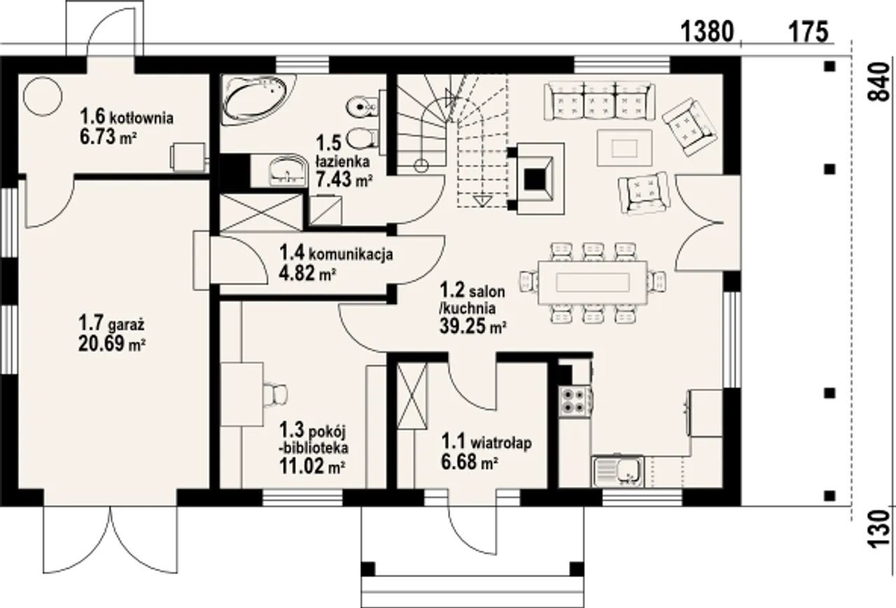 2. Kuchnia, salon | 39,25 m² |