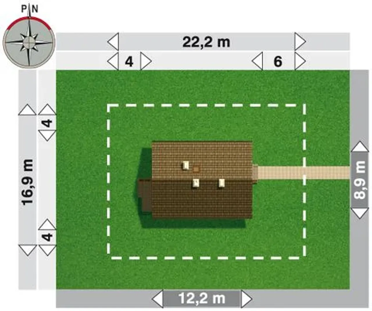 - rzut dachu - ukazuje jego kształt, wymiary, kąt nachylenia połaci, rozmieszczenie okien połaciowych, lukarn, świetlików i rur spustowych, pokazuje rozmieszczenie kominów i informuje o sposobie odwodnienia: rozmieszczeniu i rozmiarach rynien