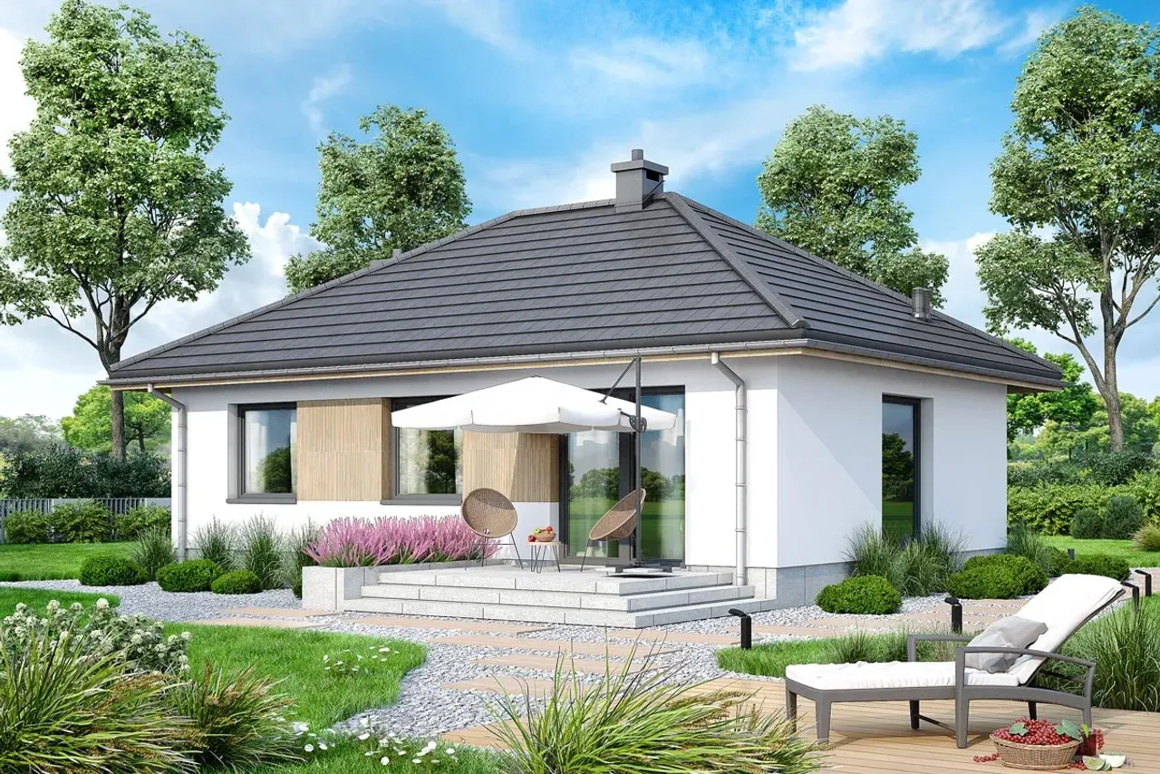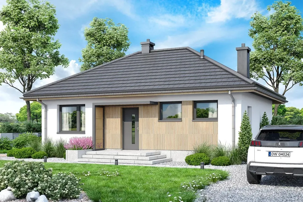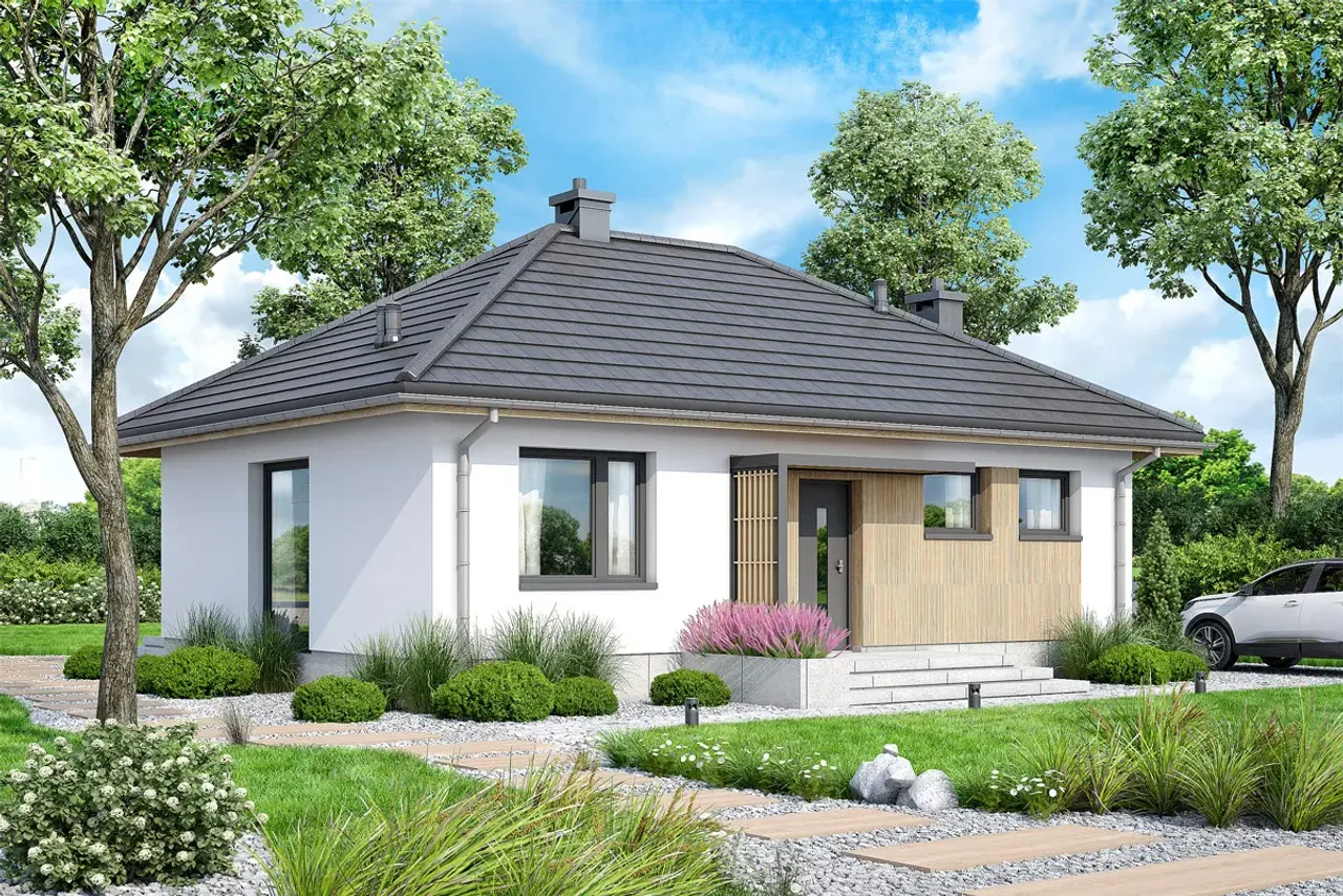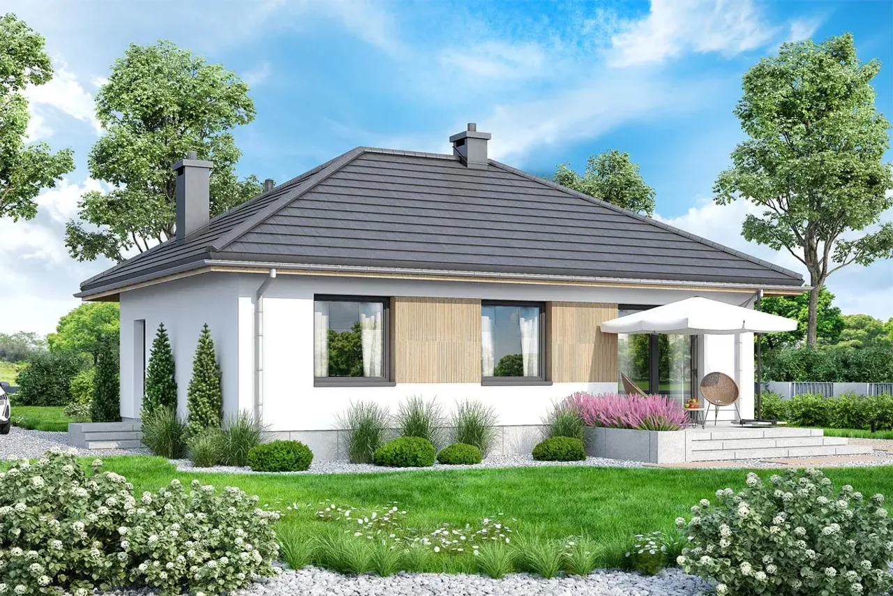Poszukujesz nowoczesnego domu jednorodzinnego, który łączy styl z funkcjonalnością? Projekt Mirabelka 2 4s to wygodny parterowy dom, zaprojektowany dla rodzin ceniących przestrzeń, światło i sprawdzone rozwiązania budowlane. Jego przemyślany układ, elegancki dach wielospadowy i kominek w salonie tworzą komfortową przestrzeń do codziennego życia przez cały rok.