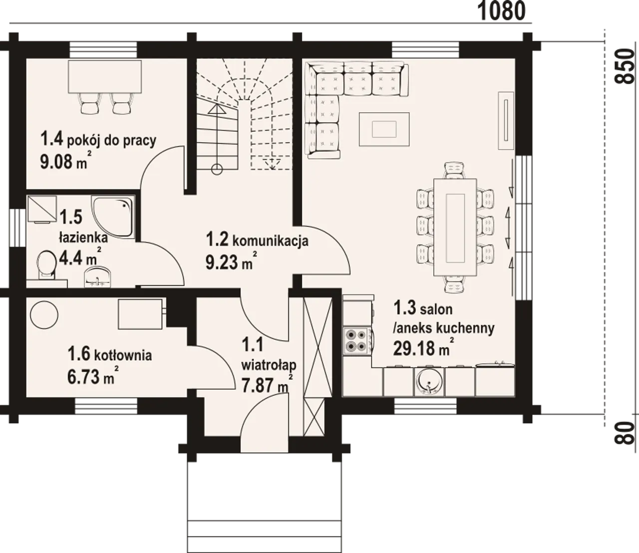 - opisu architektonicznego zawierającego m.in. opis przyjętych rozwiązań, zestawienia powierzchni (użytkowej, zabudowy, netto), kubatury oraz powierzchni poszczególnych pomieszczeń