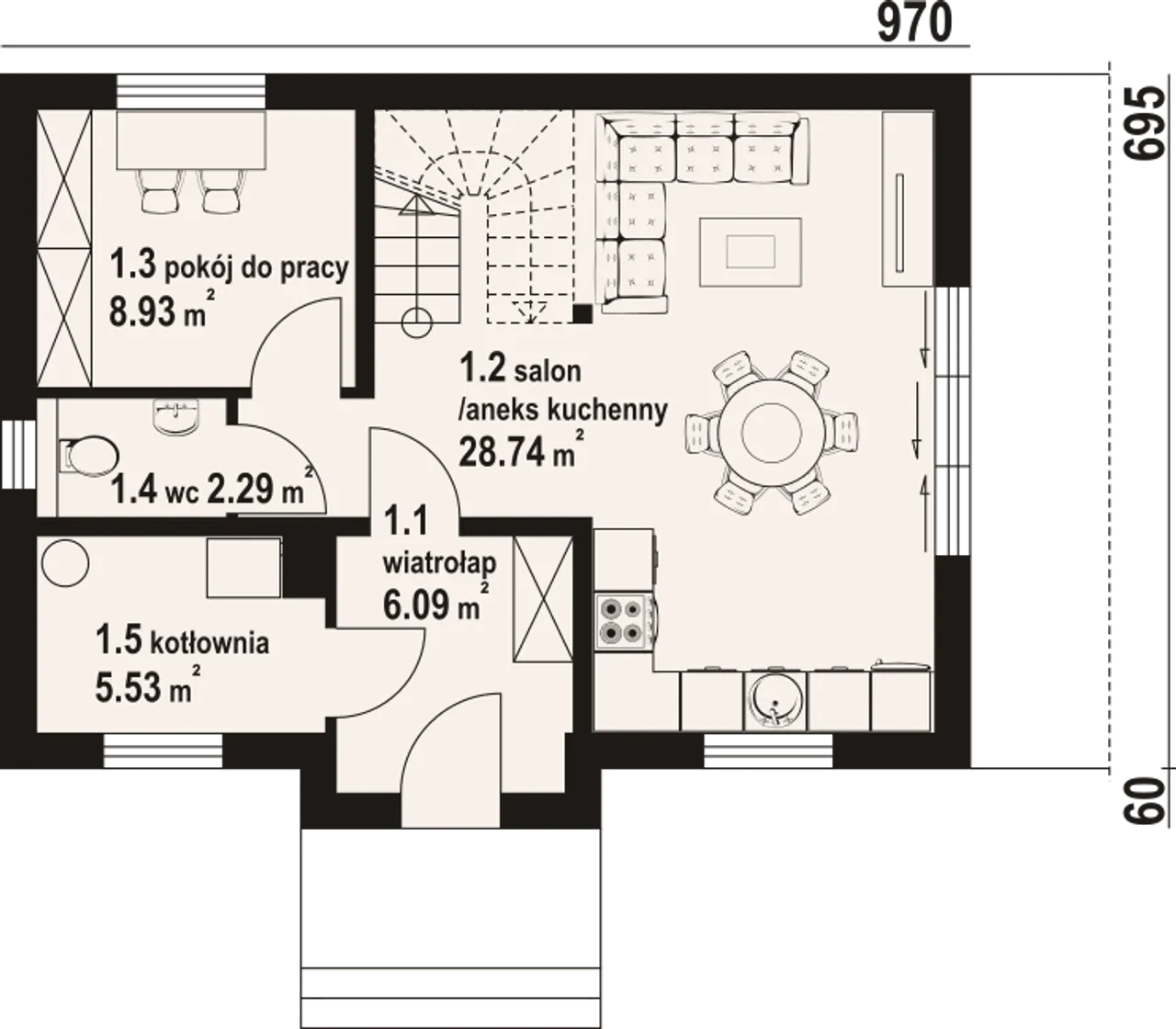Wypełnij formularz i otrzymaj rysunki w pdf z dokładnymi wymiarami budynku i pomieszczeń (długość, szerokość, wysokość) dla projektu Modrowo bb 70