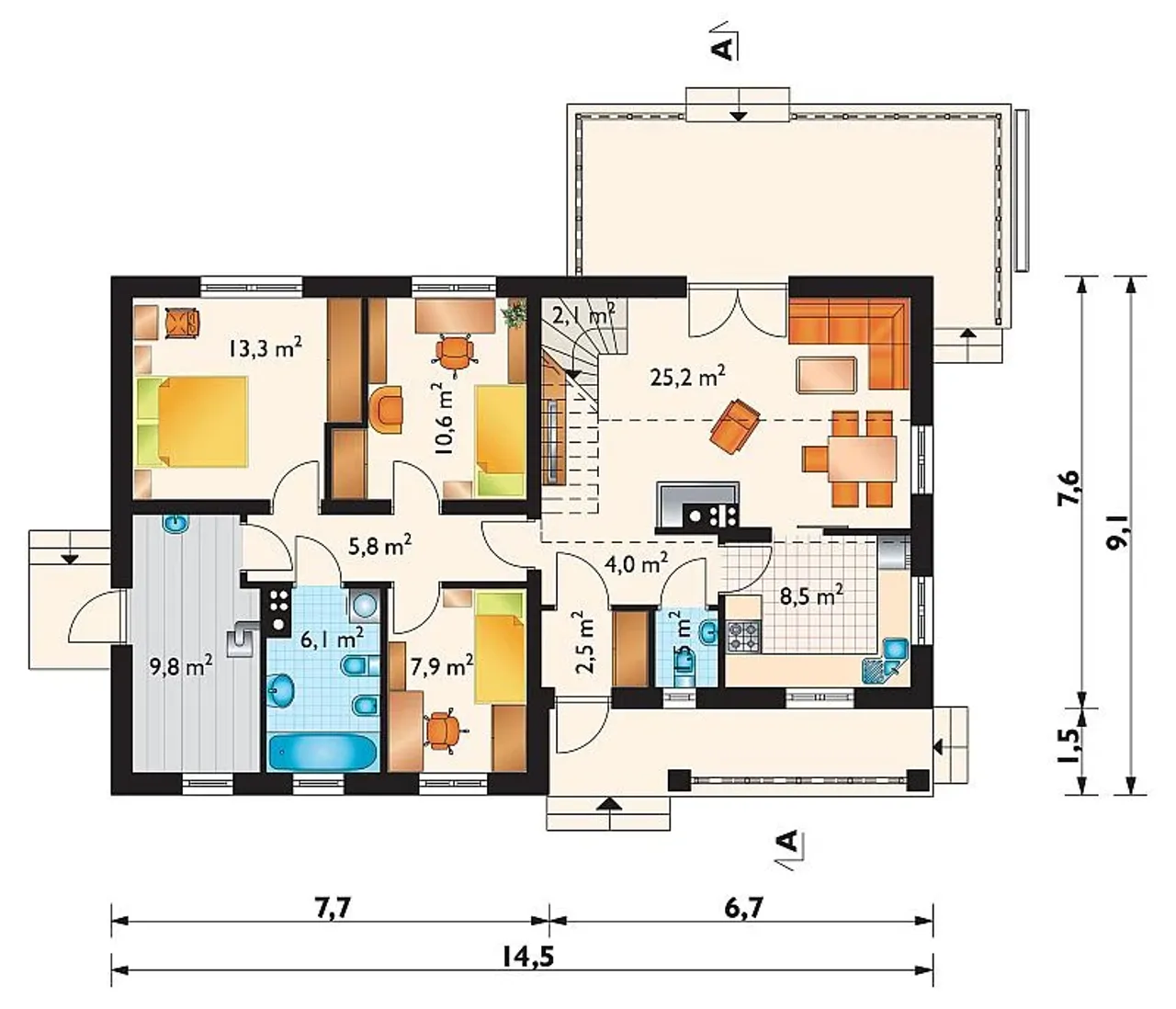 - elewacje - pokazują dokładny wygląd domu od frontu, z tyłu i z boków