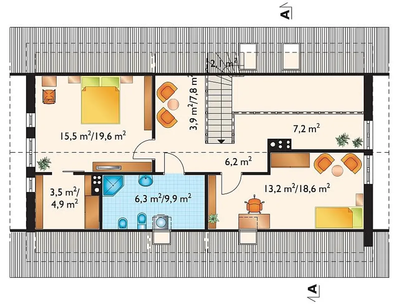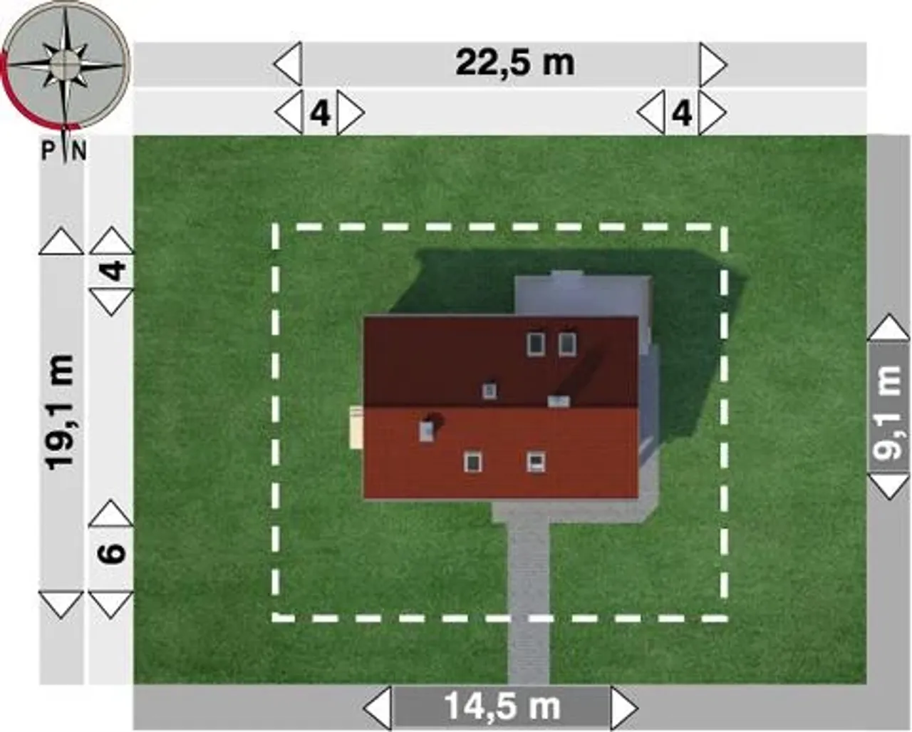- rzut dachu - ukazuje jego kształt, wymiary, kąt nachylenia połaci, rozmieszczenie okien połaciowych, lukarn, świetlików i rur spustowych, pokazuje rozmieszczenie kominów i informuje o sposobie odwodnienia: rozmieszczeniu i rozmiarach rynien