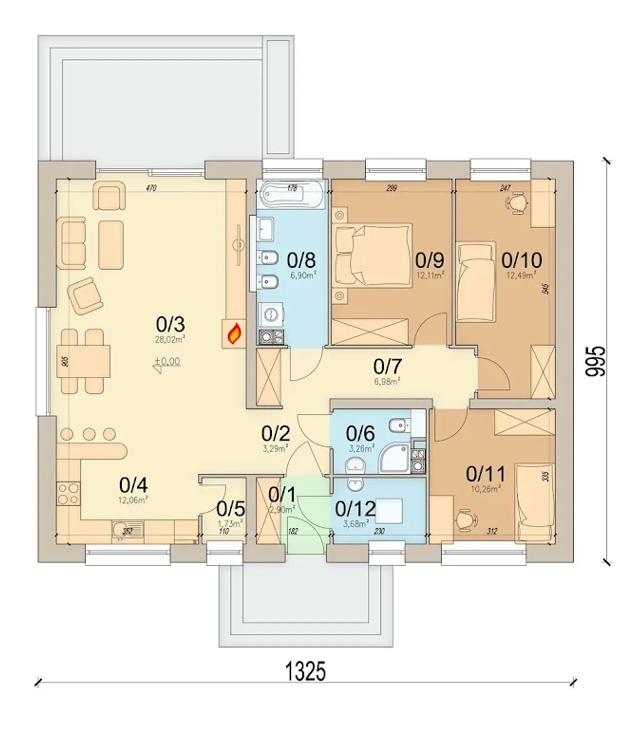 Rozplanowanie wnętrza łączy wygodę i funkcjonalność. Salon z miejscem na kominek tworzy przytulną strefę spotkań, podczas gdy bezpośrednie wyjście na taras powiększa przestrzeń użytkową i otwiera wnętrze na ogród. Kąt nachylenia dachu 30° ułatwia montaż nowoczesnych instalacji takich jak panele solarne. Brak podpiwniczenia oznacza prostszą budowę i niższe koszty inwestycyjne.
