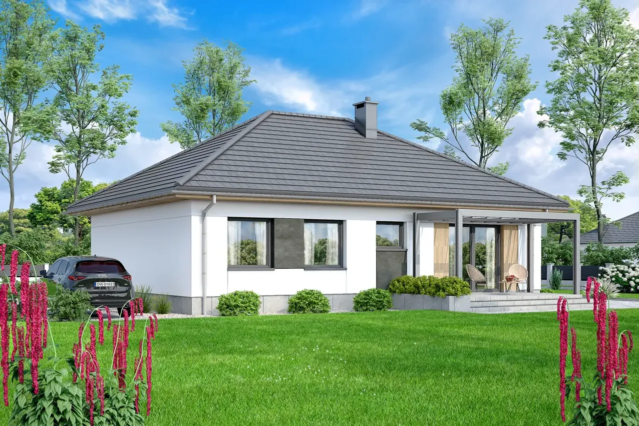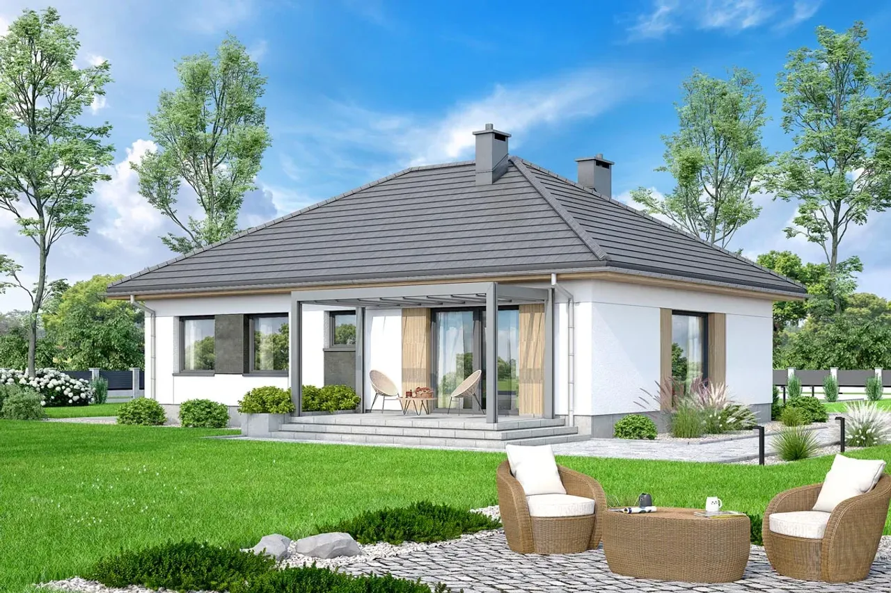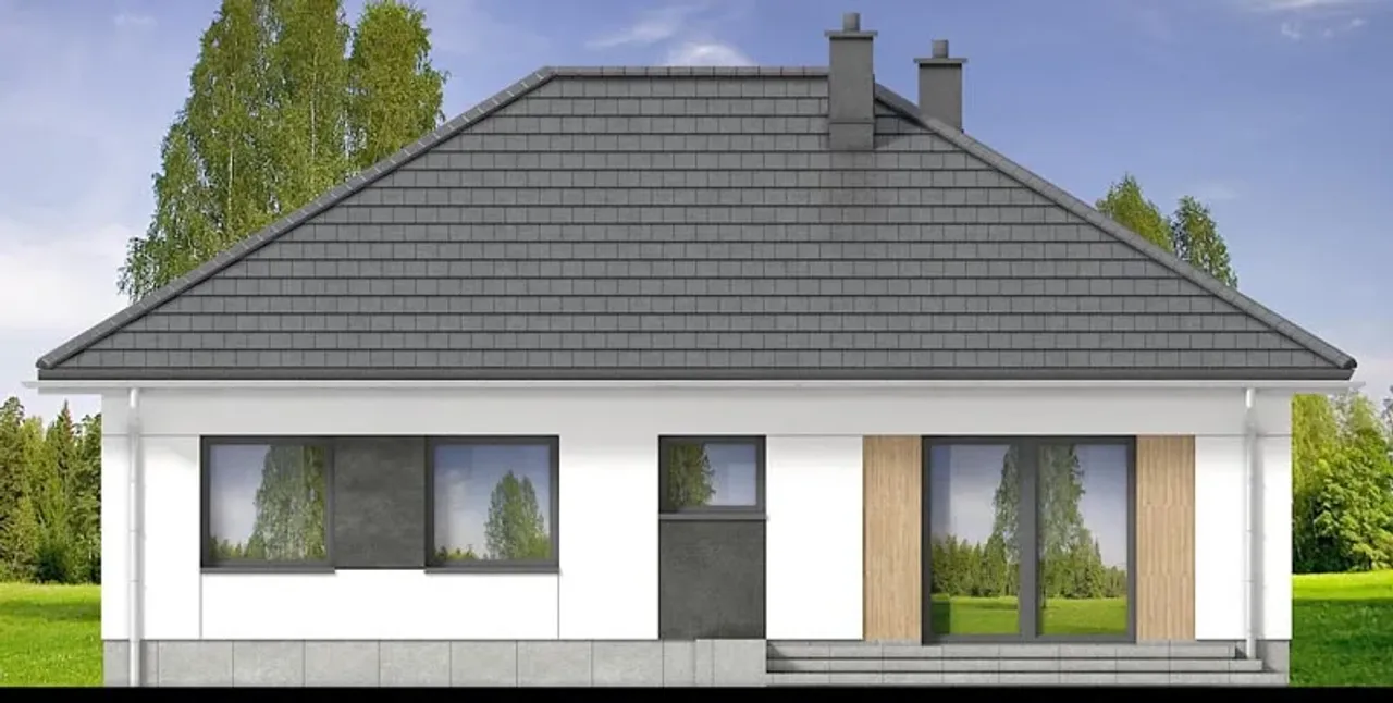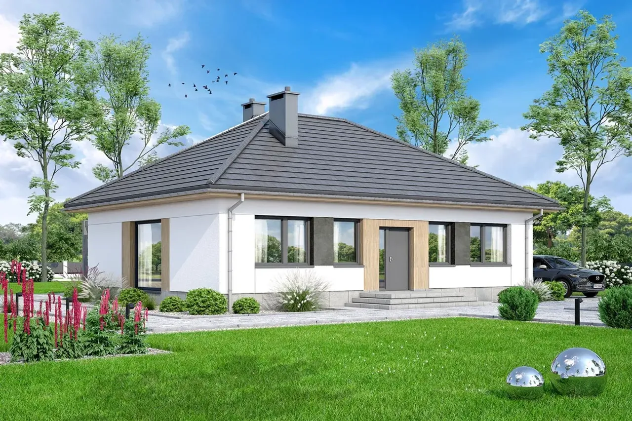 Jednym z elementów wyróżniających projekt jest wielospadowy dach o kącie nachylenia 30° - nie tylko wpisuje się w nowoczesną stylistykę, ale też doskonale chroni przed kaprysami polskiego klimatu. Konstrukcja opiera się na żelbetowych fundamentach oraz ścianach z pustaków ceramicznych, a strop monolityczny oraz dach z drewnianą więźbą, pokryty dachówką betonową lub ceramiczną, zapewniają wytrzymałość oraz komfort akustyczny wnętrz. Kominek przewidziany w projekcie pozwala cieszyć się domową atmosferą w każdy jesienny lub zimowy wieczór.