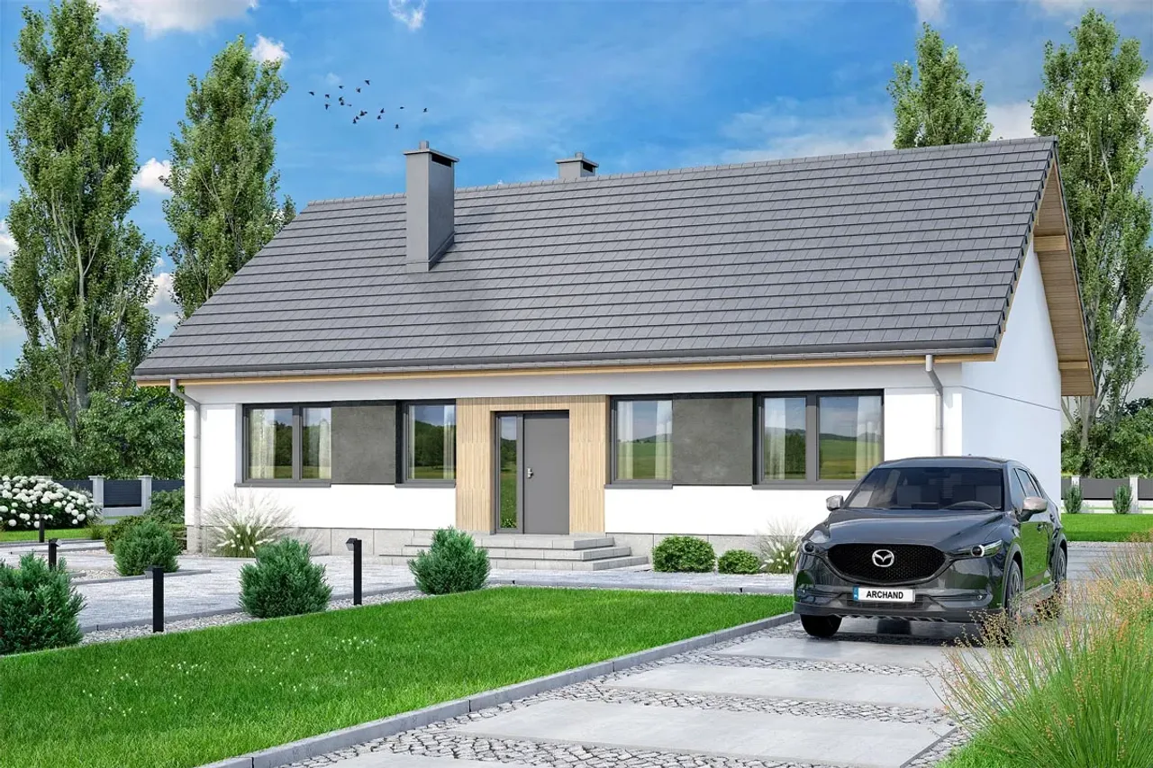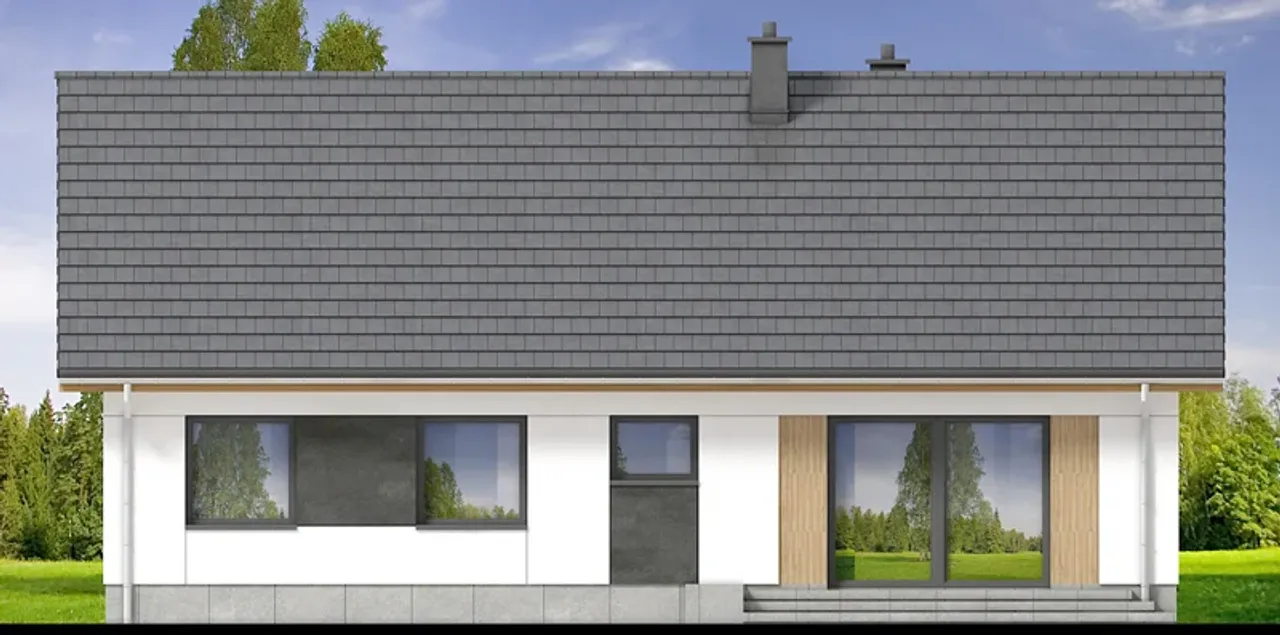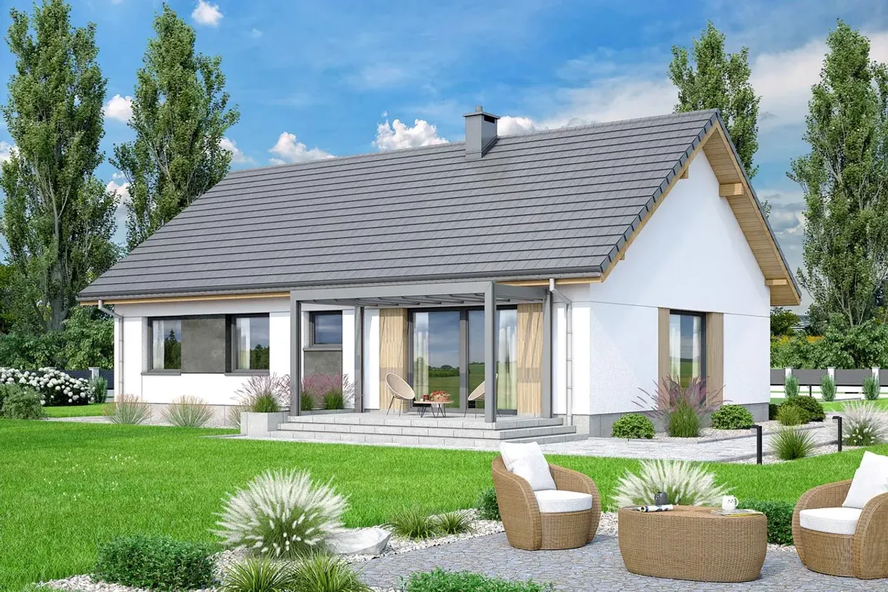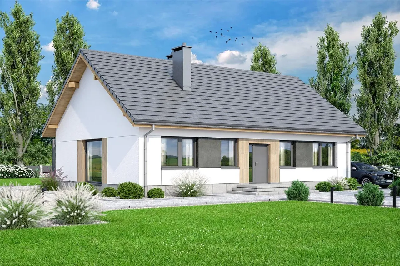Konstrukcję wieńczy monolityczny strop, gwarantujący sztywność budynku i odporność na deformacje. Drewniana więźba dachowa wpisuje się w klasyczną tradycję, a nowoczesność całości podkreśla eleganckie pokrycie dachówką betonową lub ceramiczną. Kalenica równoległa do drogi ułatwia dopasowanie projektu do wytycznych planów zagospodarowania przestrzennego. Parterowy charakter domu eliminuje konieczność korzystania ze schodów, czyniąc przestrzeń łatwo dostępną dla każdego domownika.