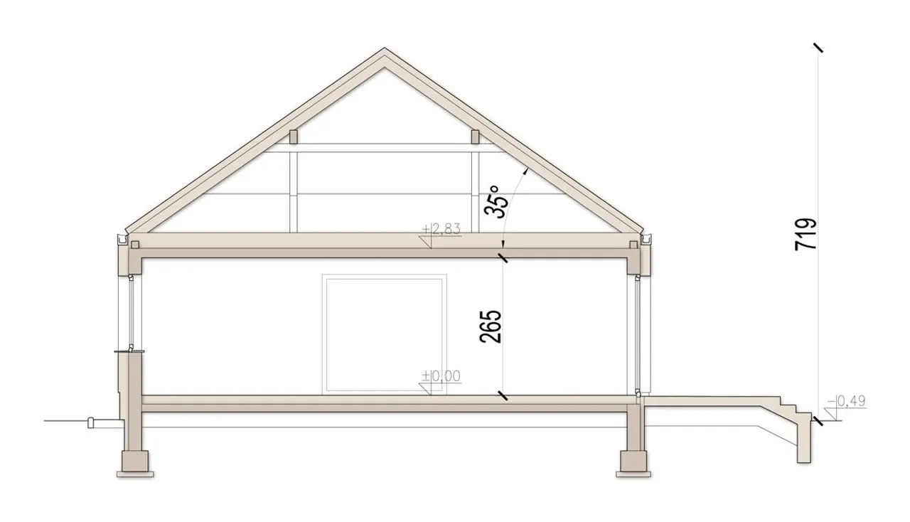 Dom oparto na nowoczesnej technologii murowanej. Nośne i działowe ściany wykonane są z pustaków ceramicznych, co pozytywnie wpływa na mikroklimat i bezpieczeństwo wnętrz. Solidne fundamenty żelbetowe oraz monolityczny strop tworzą niezawodną podstawę na długie lata. Dwuspadowy dach o kącie nachylenia 35 stopni, z drewnianą konstrukcją i pokryciem z dachówki betonowej lub ceramicznej, harmonijnie dopełnia nowoczesną sylwetkę domu, jednocześnie podnosząc jego walory użytkowe.