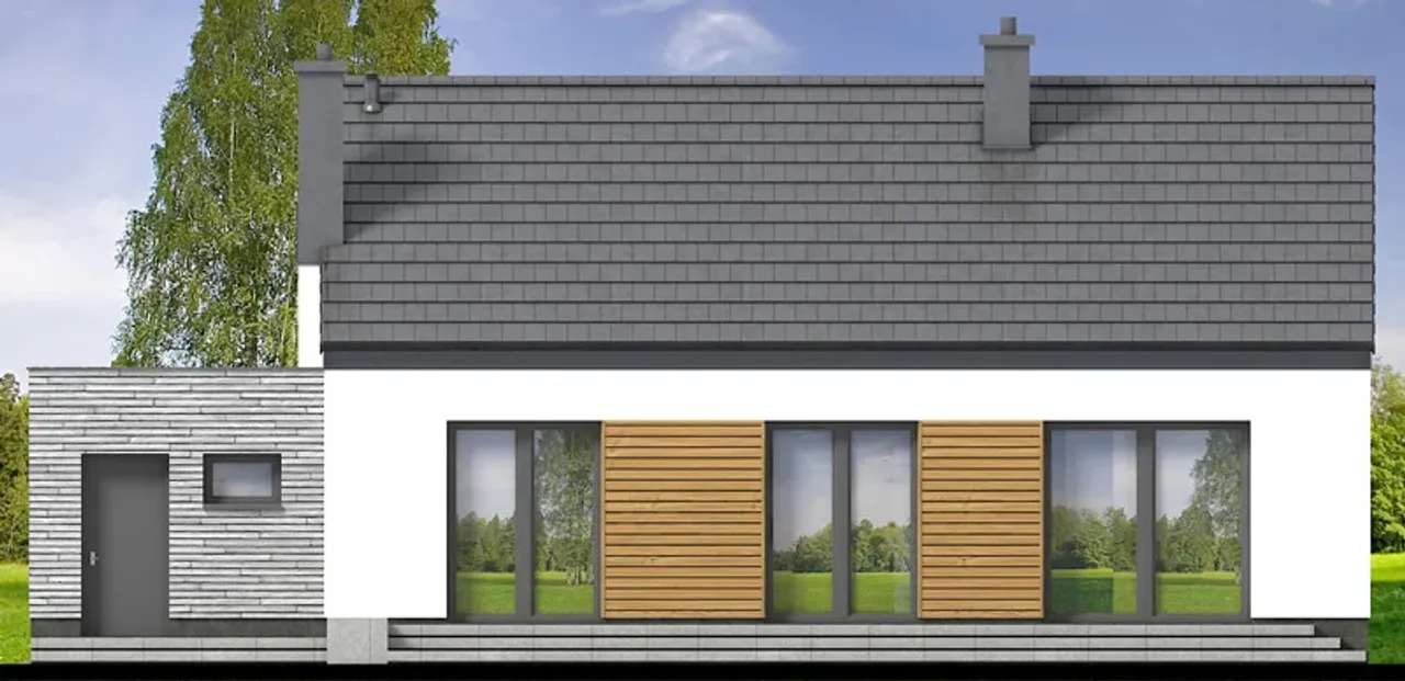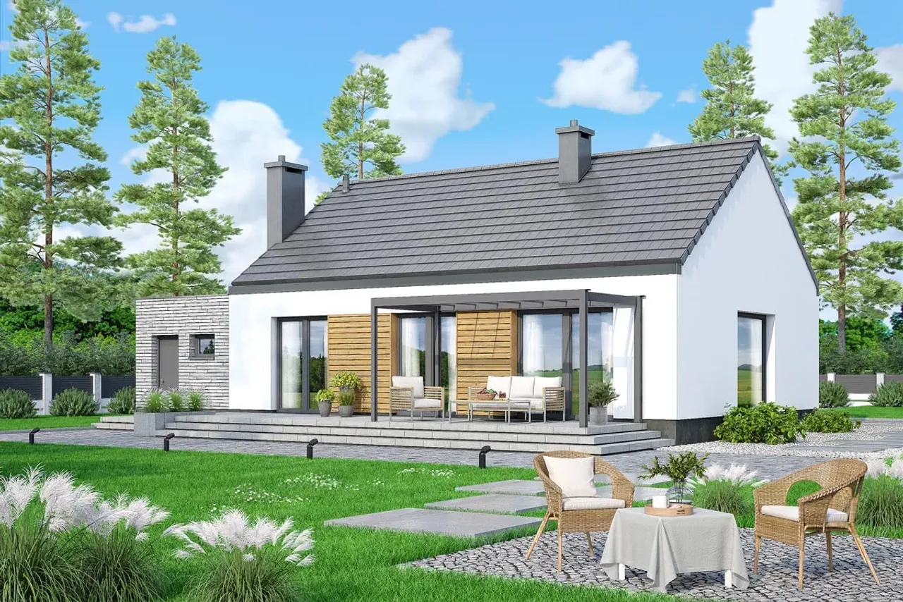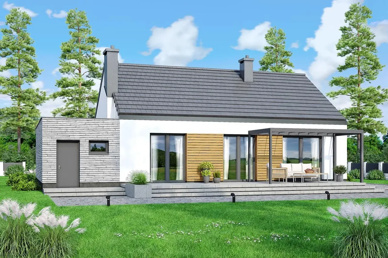 Stonowana, lecz nowoczesna bryła budynku harmonizuje z krajobrazem, a możliwość zastosowania dowolnej dachówki ceramicznej lub betonowej pozwala dopasować dom do własnych upodobań i budżetu. Wnętrze z czterema pokojami oferuje różnorodne możliwości adaptacji dla rodziny, gości lub osób pracujących zdalnie. Kominek został przewidziany w projekcie - rozgrzeje i umili wspólne wieczory niezależnie od pory roku.