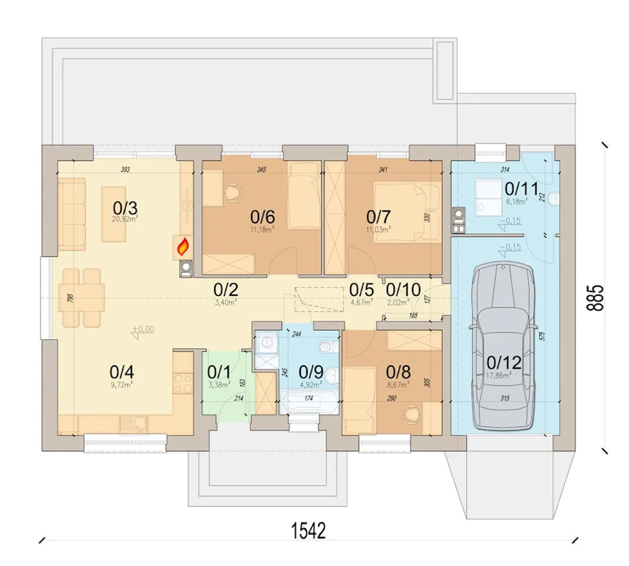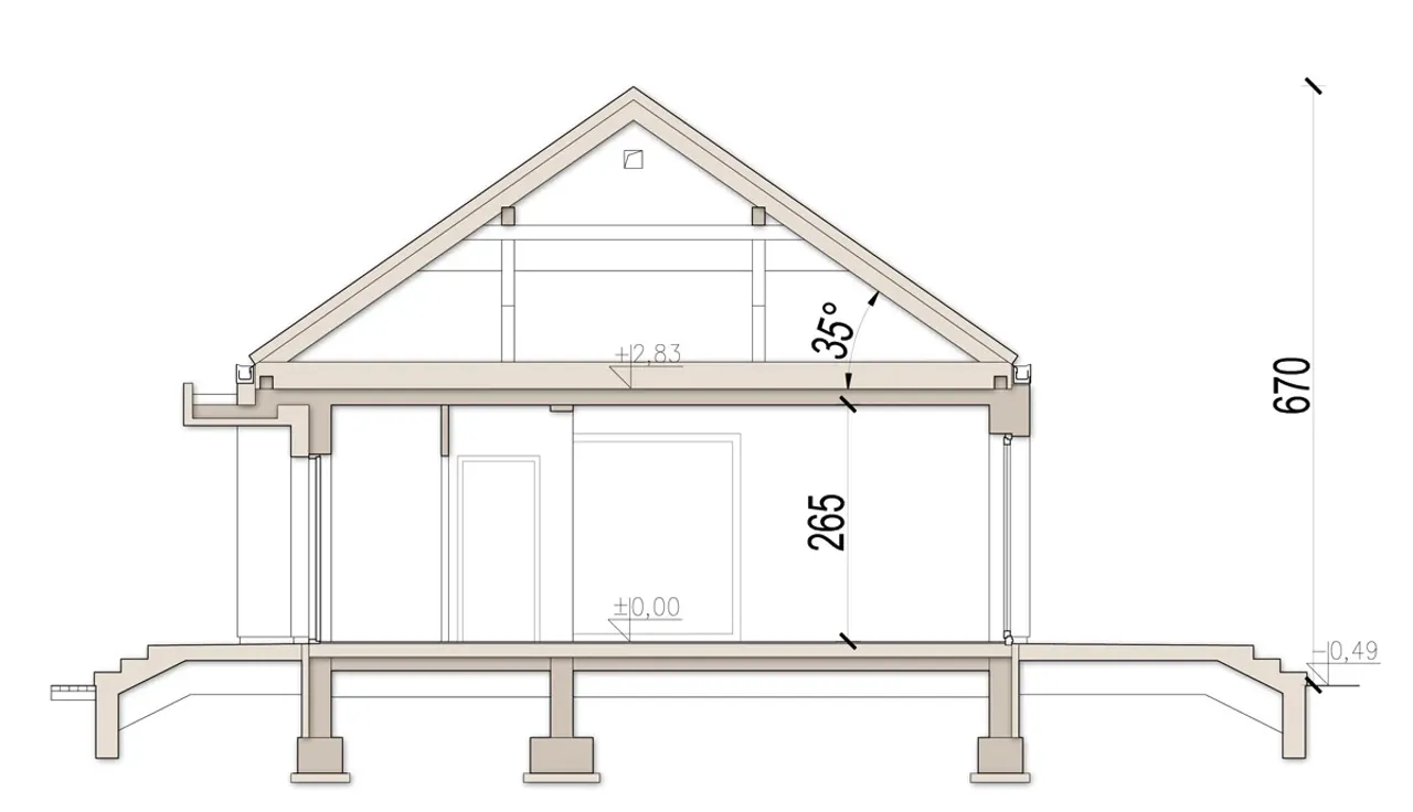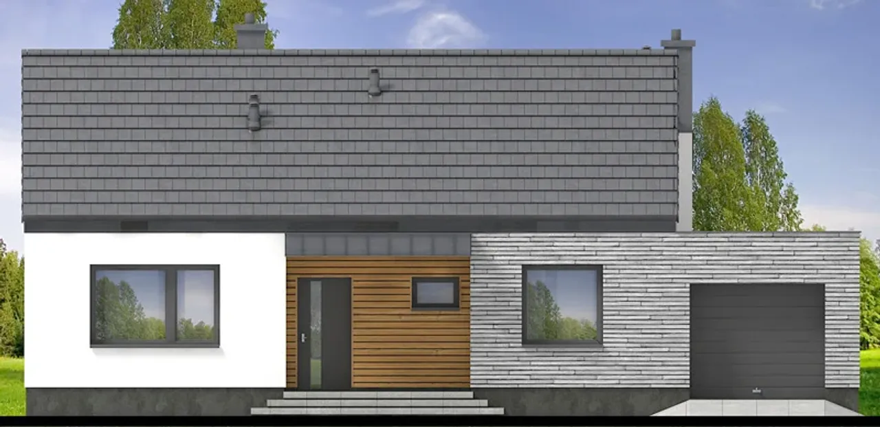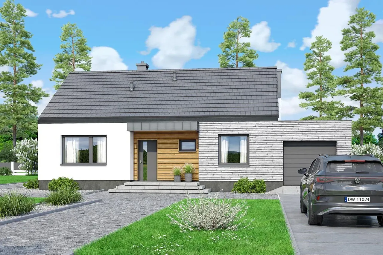 Stonowana, lecz nowoczesna bryła budynku harmonizuje z krajobrazem, a możliwość zastosowania dowolnej dachówki ceramicznej lub betonowej pozwala dopasować dom do własnych upodobań i budżetu. Wnętrze z czterema pokojami oferuje różnorodne możliwości adaptacji dla rodziny, gości lub osób pracujących zdalnie. Kominek został przewidziany w projekcie - rozgrzeje i umili wspólne wieczory niezależnie od pory roku.