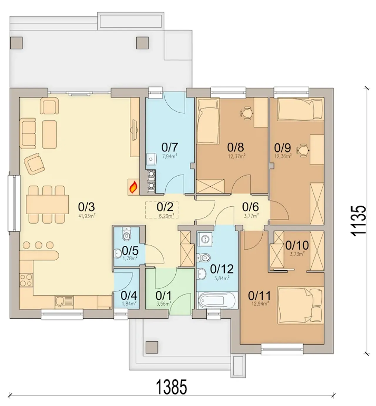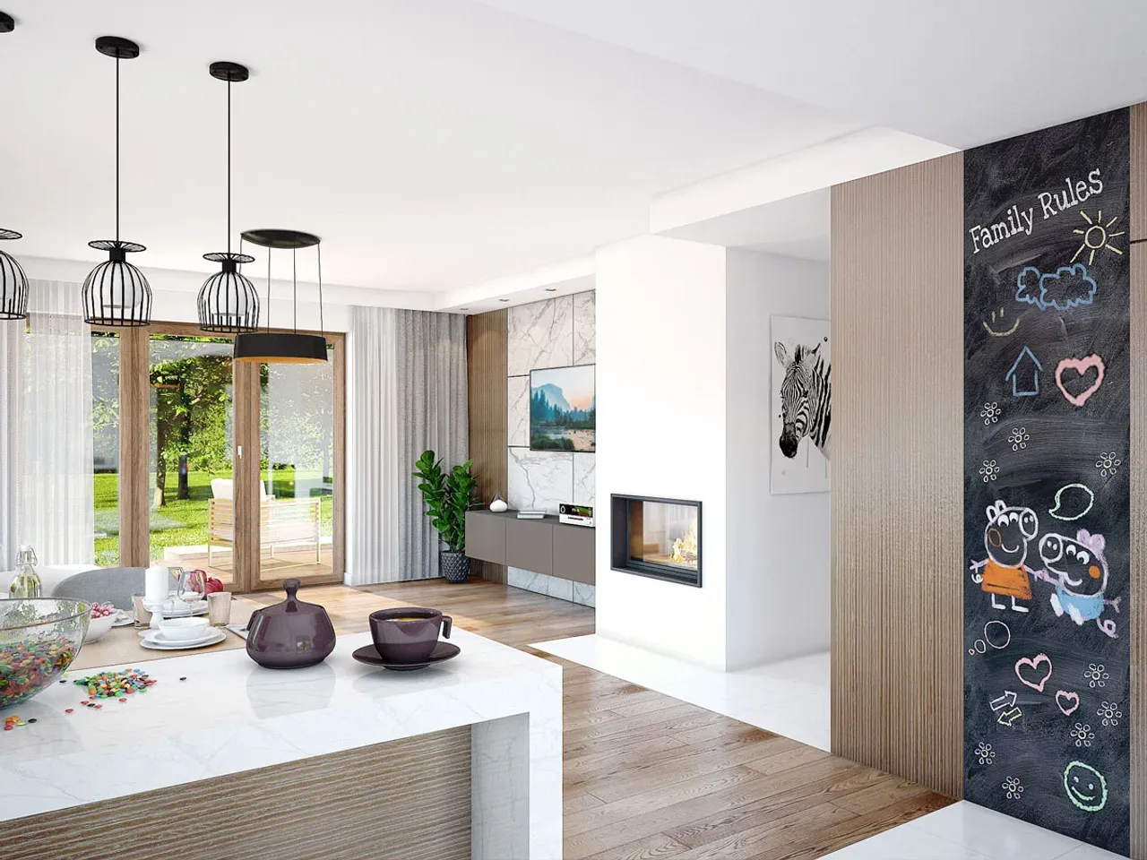 Dom wybudowany w technologii murowanej, bez garażu, z przestronnym tarasem, będzie świetnym miejscem do wypoczynku i spotkań z bliskimi. Konstrukcja przewiduje także kominek w salonie - idealny na chłodniejsze dni.